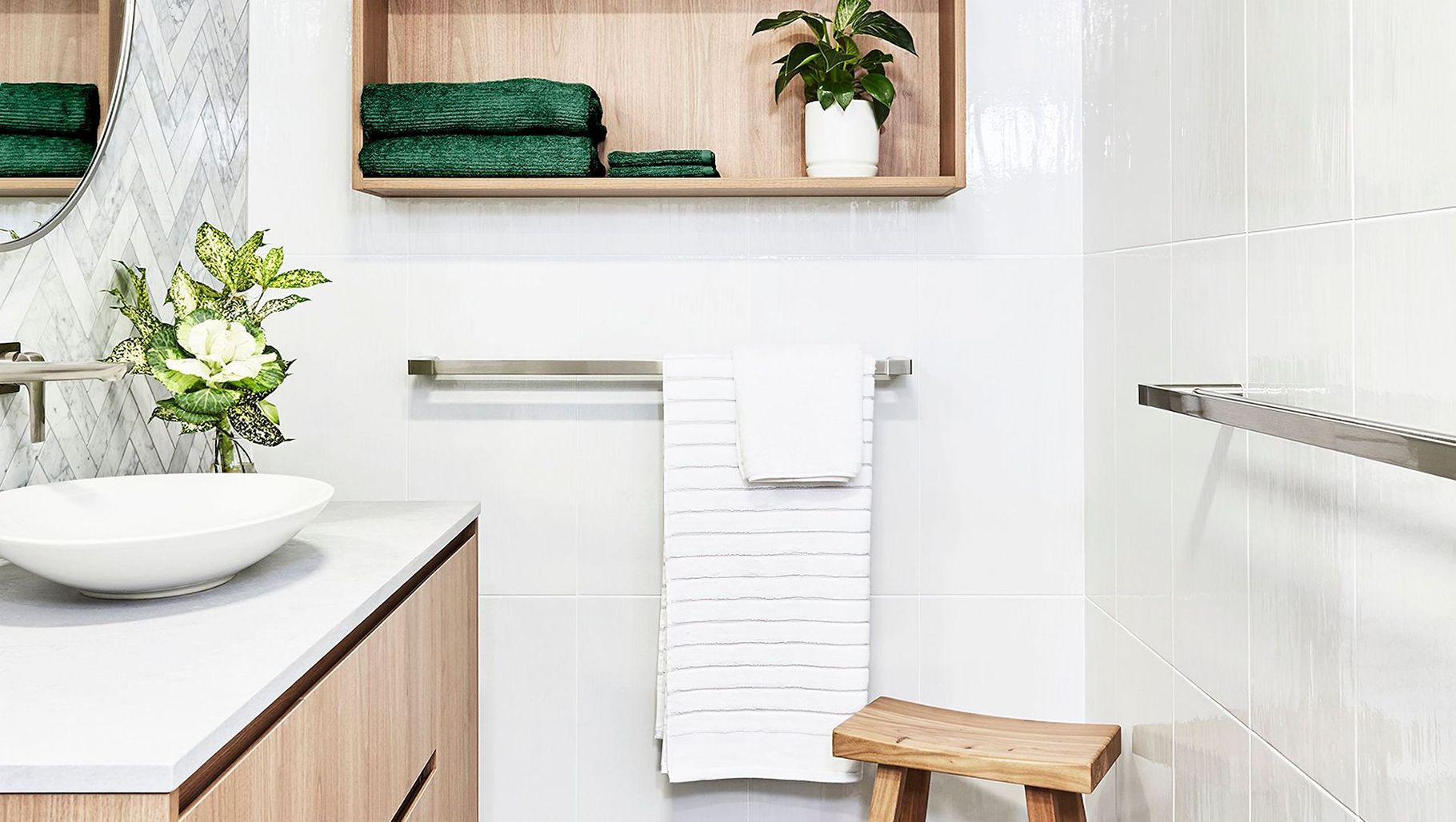 ArchiPro Project Summary - A thoughtfully designed internal bathroom featuring timber look cabinetry and a textured feature wall, creating a warm and inviting atmosphere despite the absence of natural light.