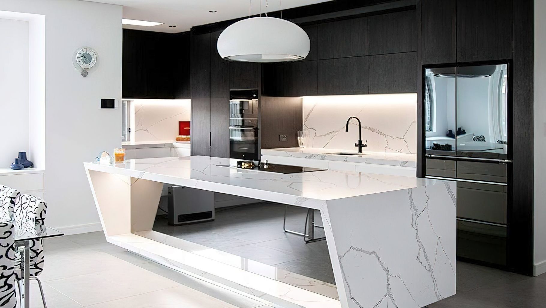 ArchiPro Project Summary - Luxurious residential home featuring Vivid White and Satin Black Polypaint MRPB, complemented by an Elica range hood, Vixen sink pull-out spray mixer, under-mount sink, and exquisite Calacatta fantasy stone, completed in 2020.