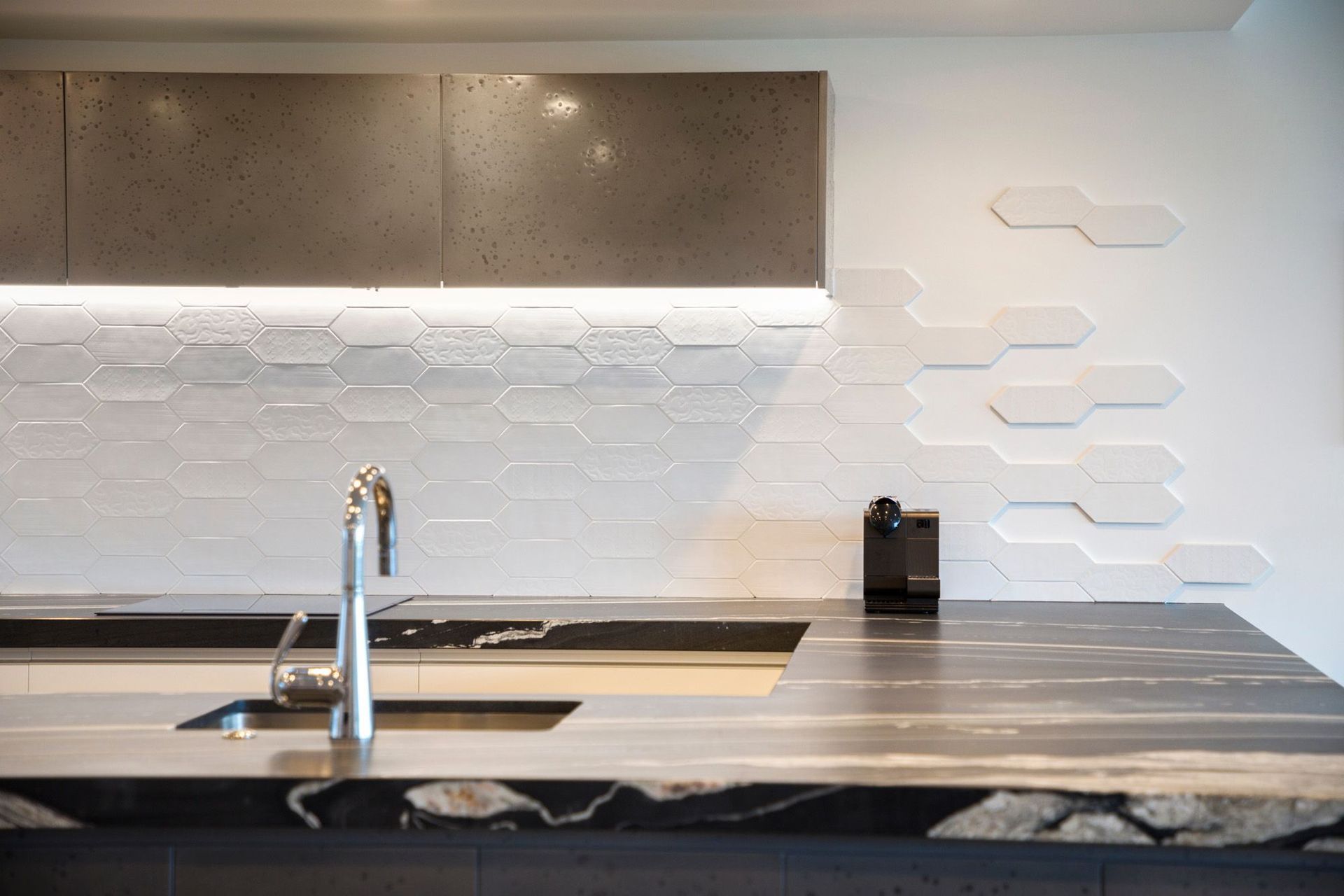 ArchiPro Project Summary - A contemporary kitchen designed for functionality and elegance, featuring rich leather-textured bench tops, sleek cabinetry, and unique tile accents, all complemented by seamless stainless steel appliances for a polished and clutter-free aesthetic.