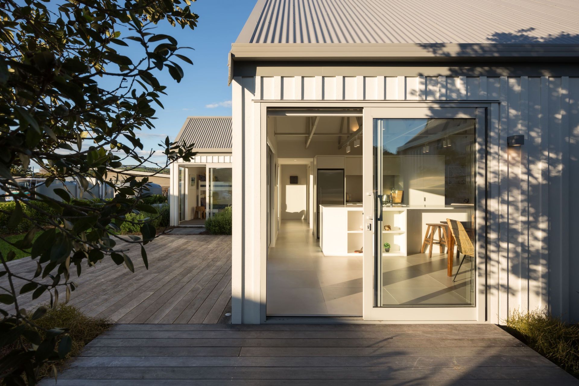 ArchiPro Project Summary - Contemporary holiday home featuring pitched roofed pods designed for optimal sun exposure and outdoor living, completed in 2015 with understated materials that reflect the coastal essence.