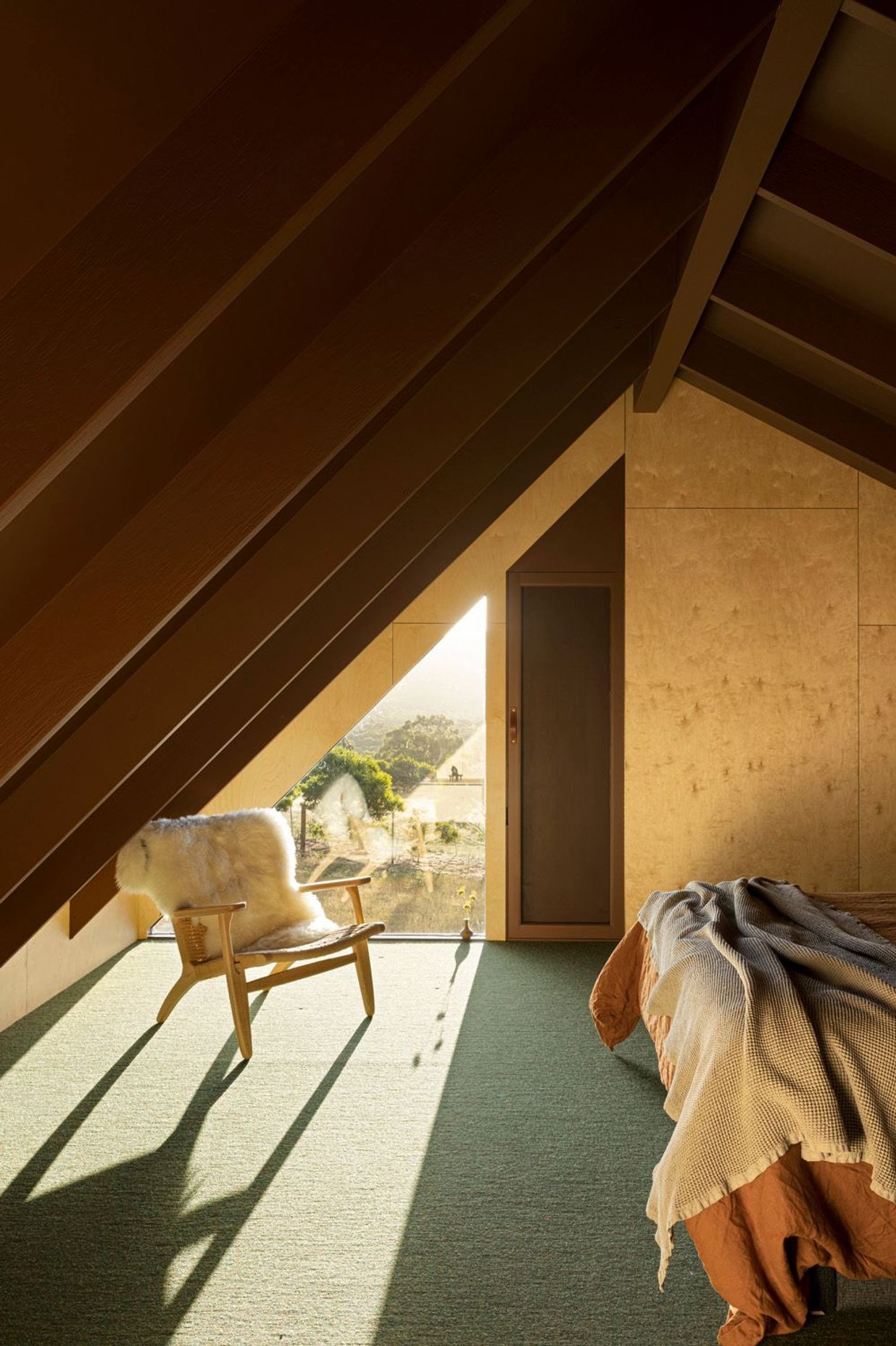 “Internally, the contrast of lofty volumes and snug spaces are accentuated by a utilitarian palette of plywood linings and concrete floors, which draw focus to a dramatic ceiling lined with Coopworth wool from the property,” says Fiona. “Sealed with clear, polycarbonate corrugated sheeting, the wool adds to the thermal performance while celebrating the agricultural connections as an abstract wool fresco.”