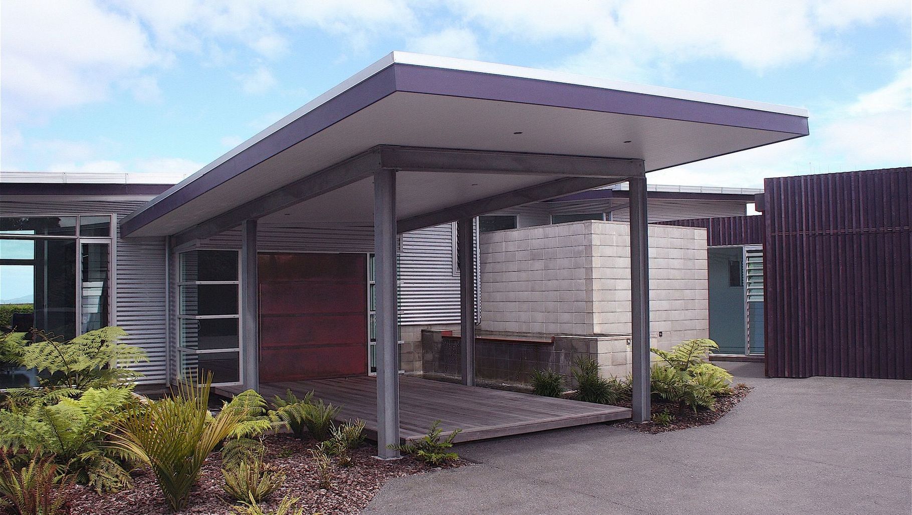 ArchiPro Project Summary - A modern open plan house showcasing an industrial aesthetic through the extensive use of colour-steel, block, and polished concrete, complemented by a striking oversized copper front door that elegantly opens over a thoughtfully designed water feature.