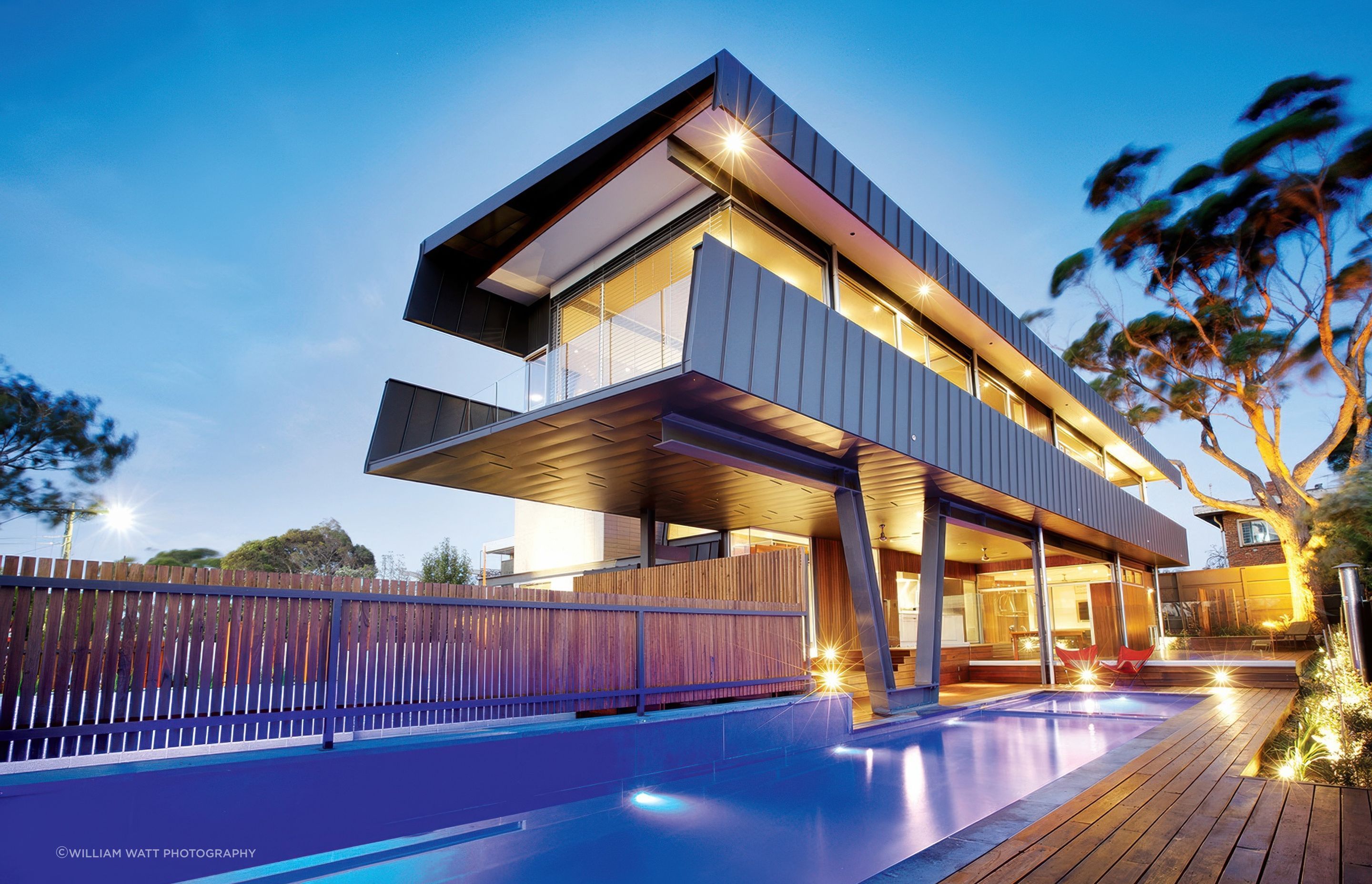ArchiPro Project Summary - Coronet Grove Residence features a striking design with a cantilevered black zinc-clad living area and a two-storey masonry sleeping quarter, offering breathtaking 270-degree views of Port Philip Bay and a seamless integration of indoor and outdoor spaces.