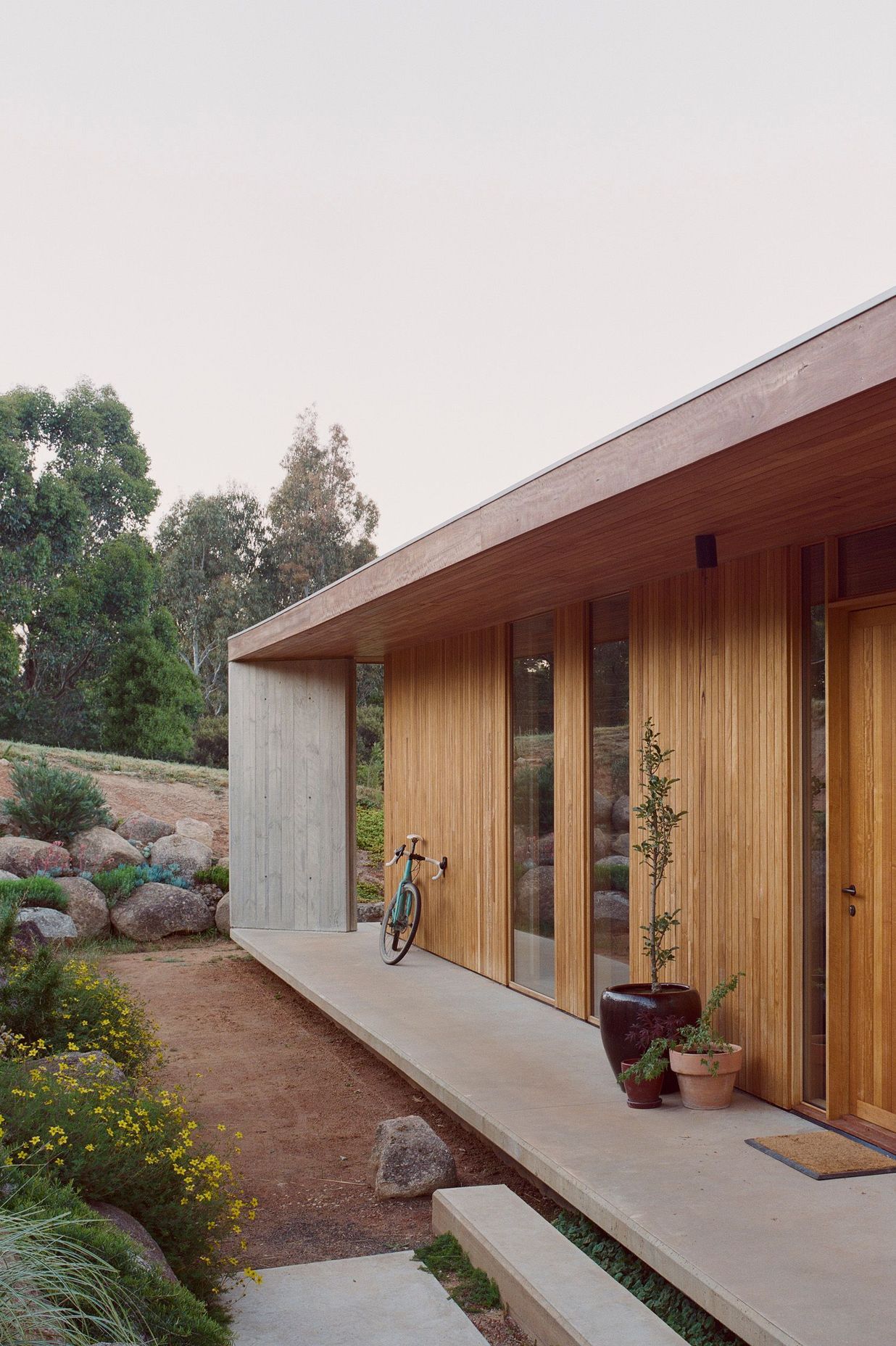 ArchiPro Project Summary - Court House: A retro-inspired home in Yackandandah, designed by Archier, featuring expansive glass walls and three Archetto Lift Slide doors that enhance natural light and air flow, centered around a tranquil landscaping area.