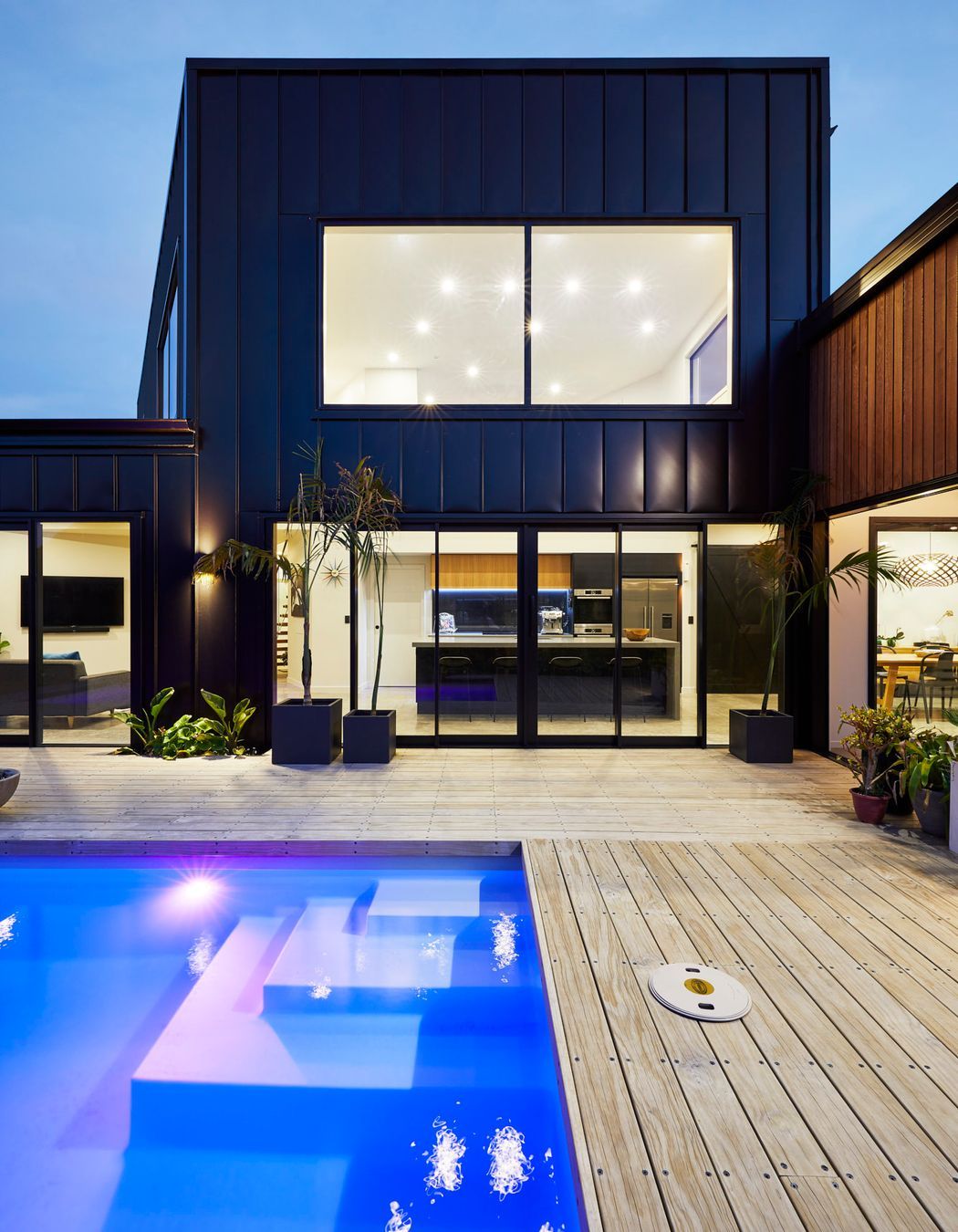 ArchiPro Project Summary - Contemporary design featuring a central swimming pool, double-height living areas, and a master suite retreat, complemented by year-round outdoor living and a selection of modular materials.