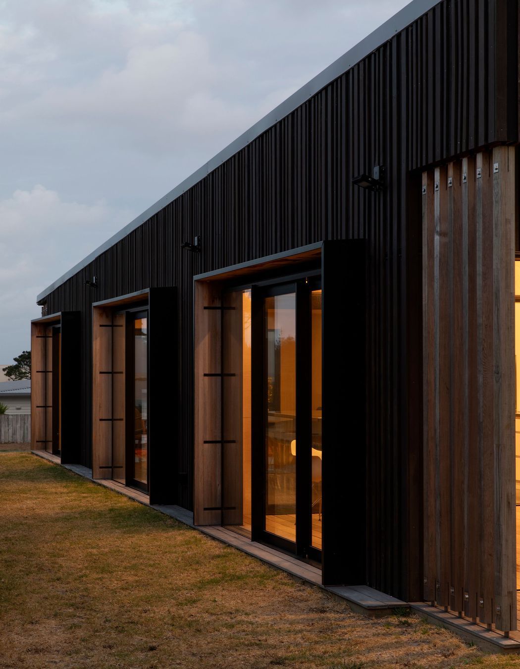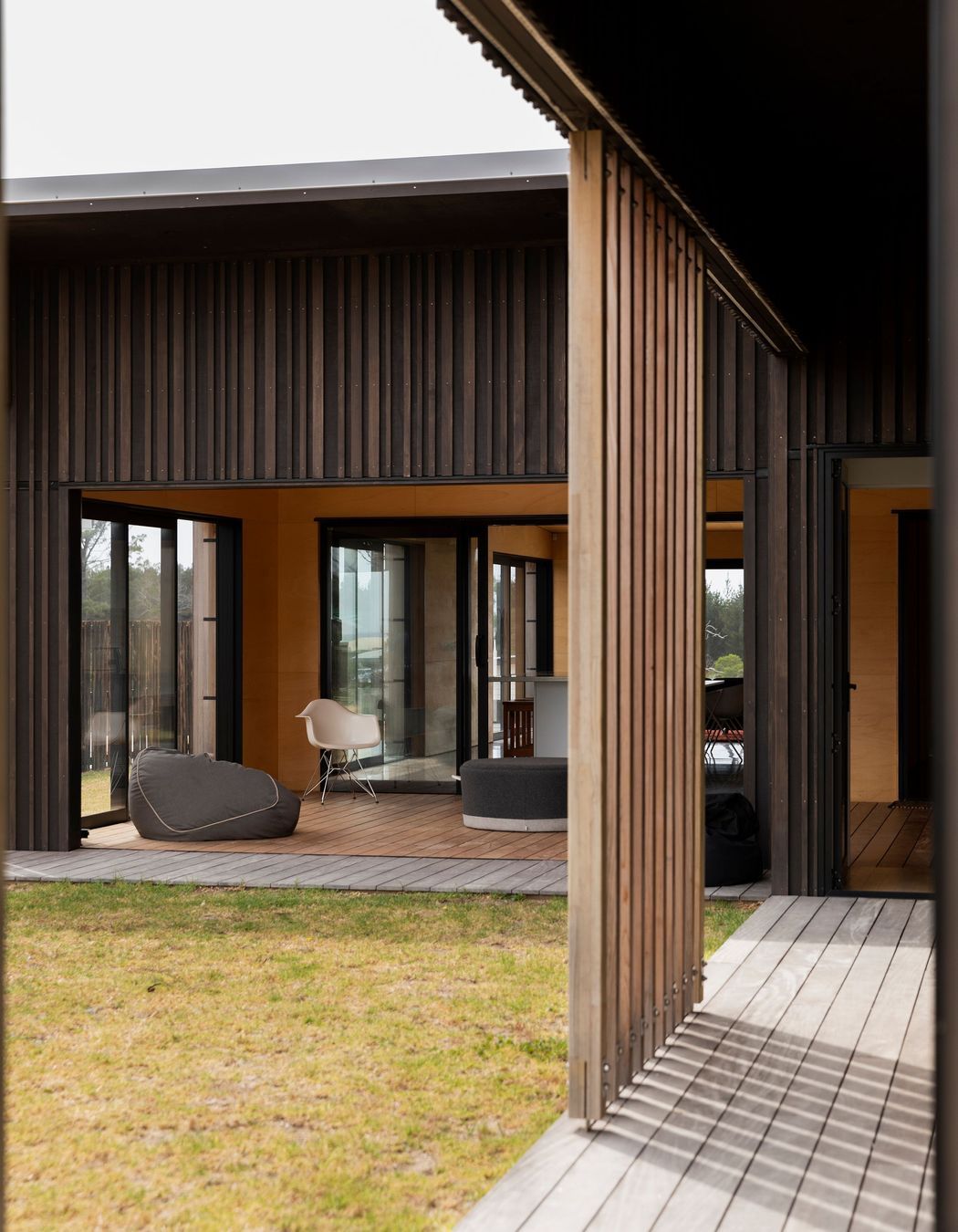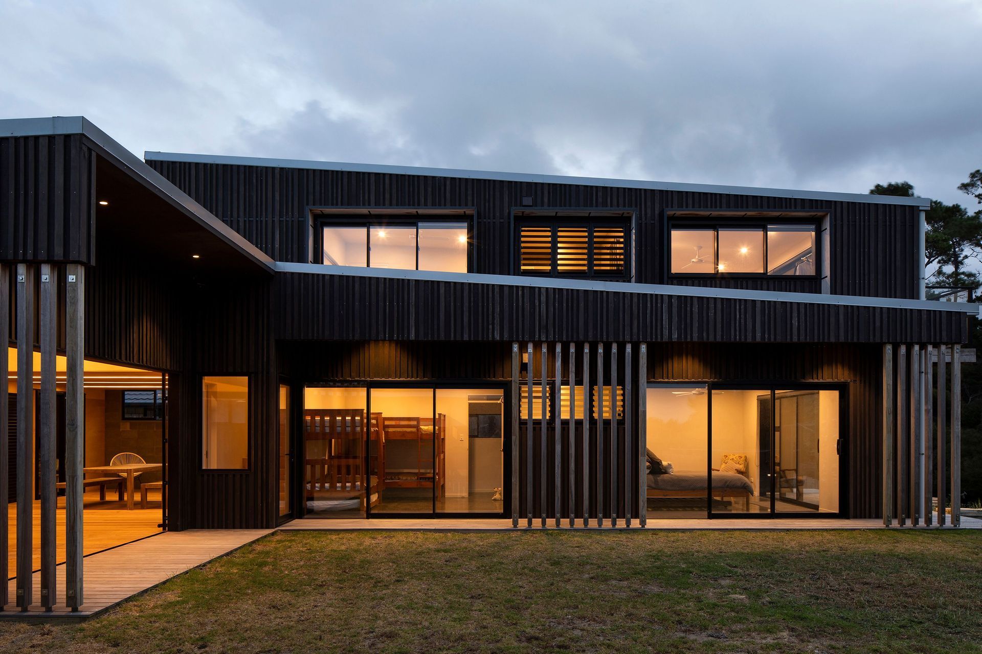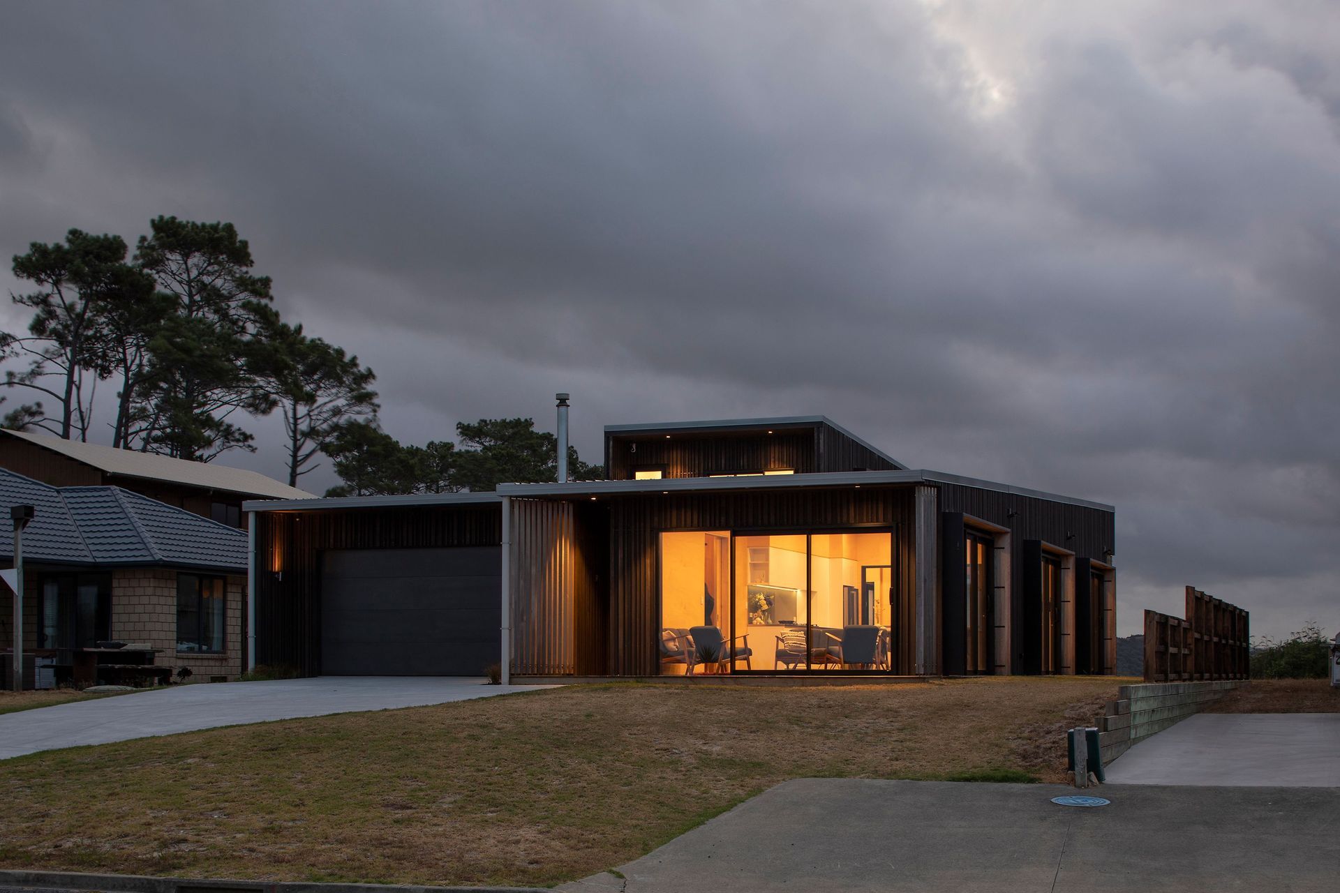 ArchiPro Project Summary - Crest House: A harmonious family bach that seamlessly integrates with its natural surroundings, featuring free-flowing spaces, dark-stained ply cladding, and expansive openings that invite the landscape inside, embodying the essence of relaxed Kiwi living.