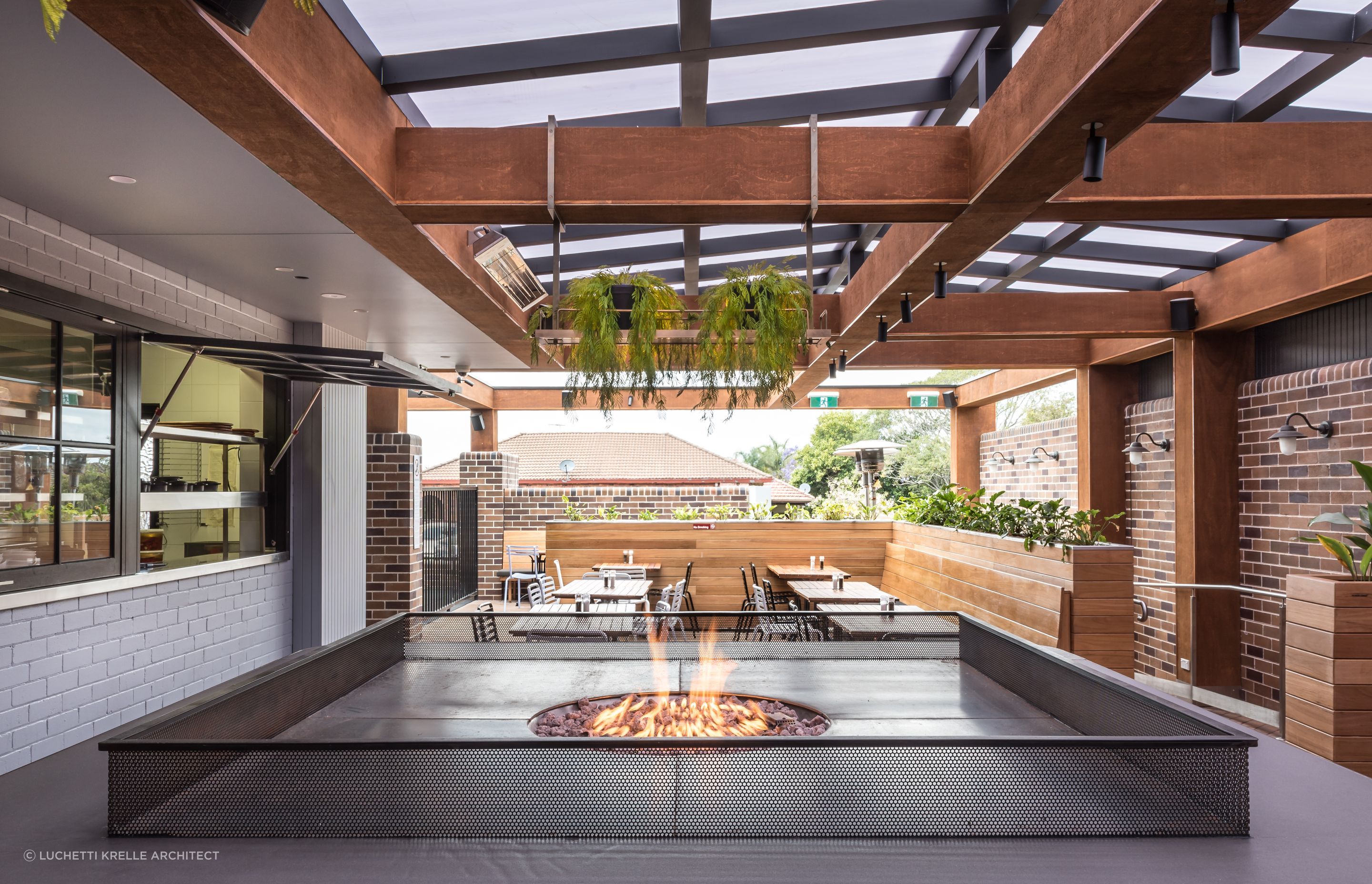 ArchiPro Project Summary - Refurbishment of Crossways Hotel in Strathfield, featuring a stylish new courtyard, a transformed main bar with decorative elements, and an elegant façade with custom finishes, designed in collaboration with Luchetti Krelle.