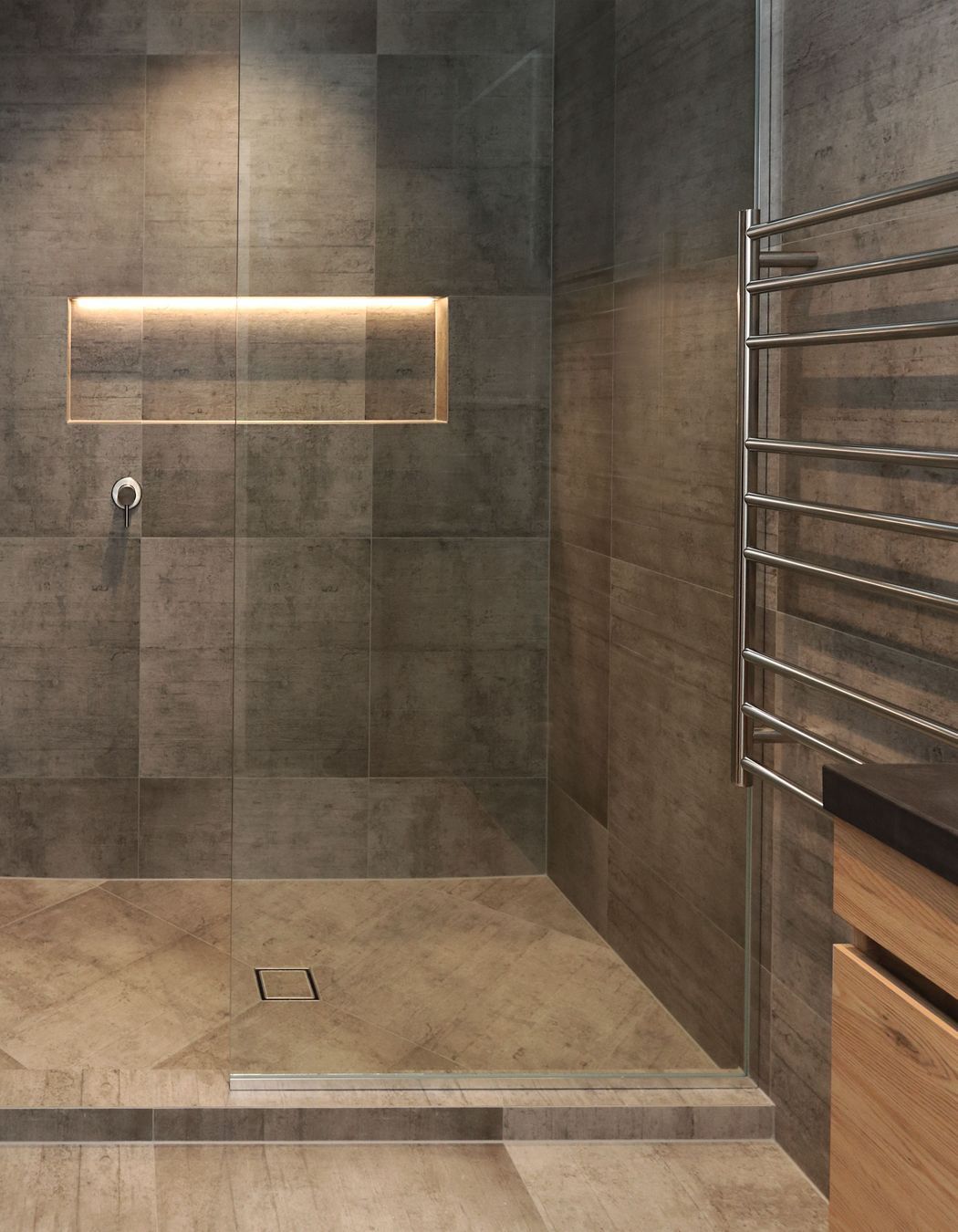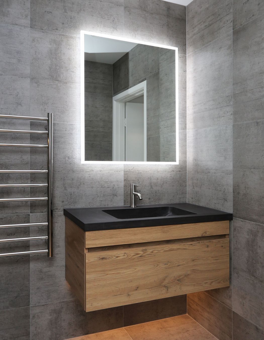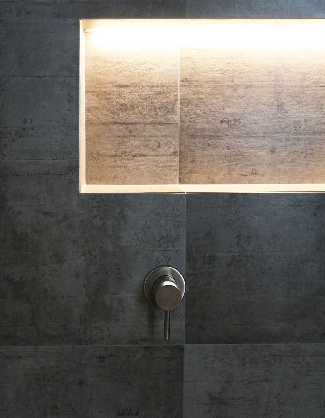 ArchiPro Project Summary - A captivating bathroom featuring a striking blend of cool tiles and warm LED lighting, complemented by a French Oak Velvet vanity and bespoke concrete top, creating a daring and moody space with practical storage solutions.