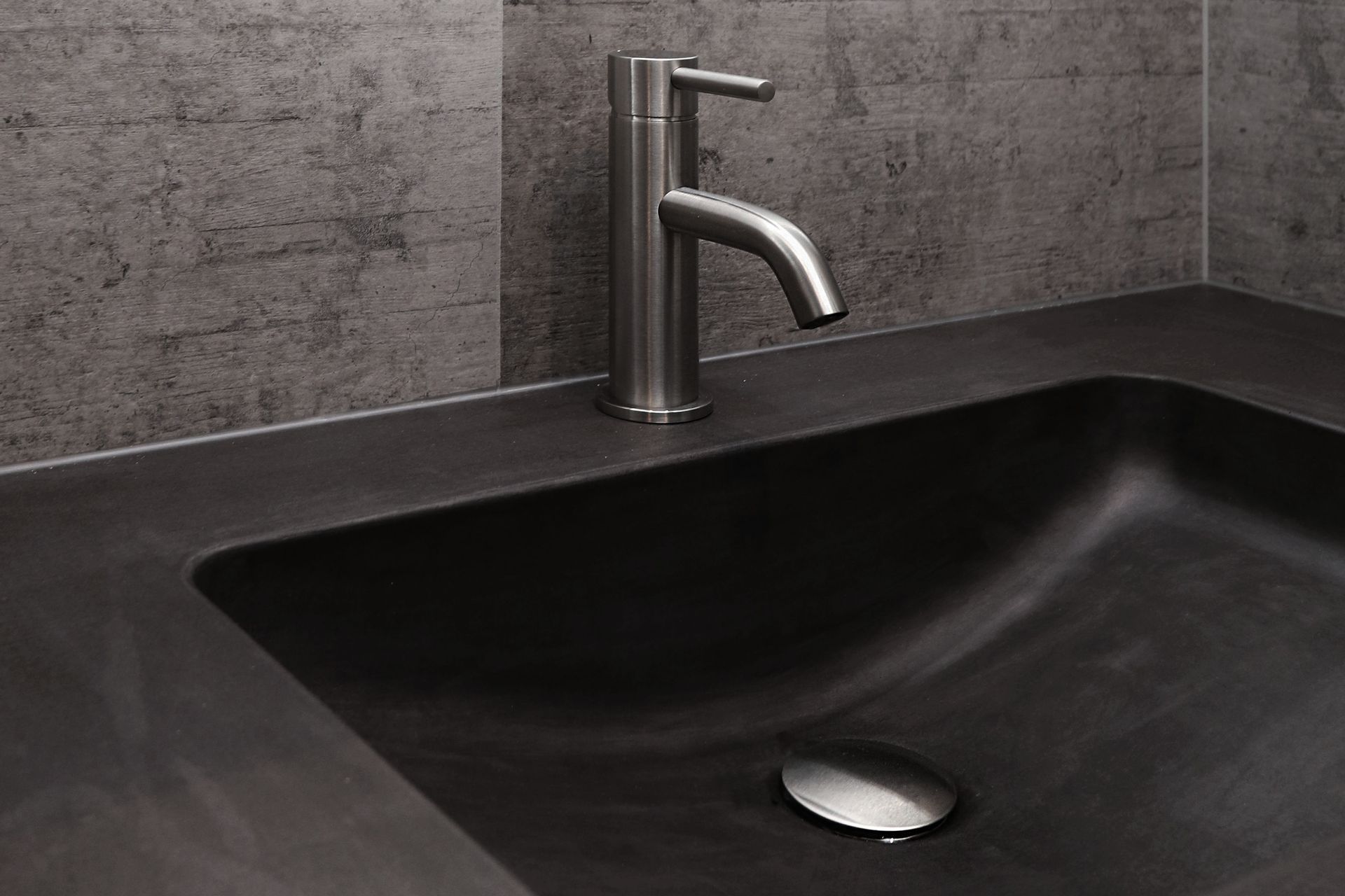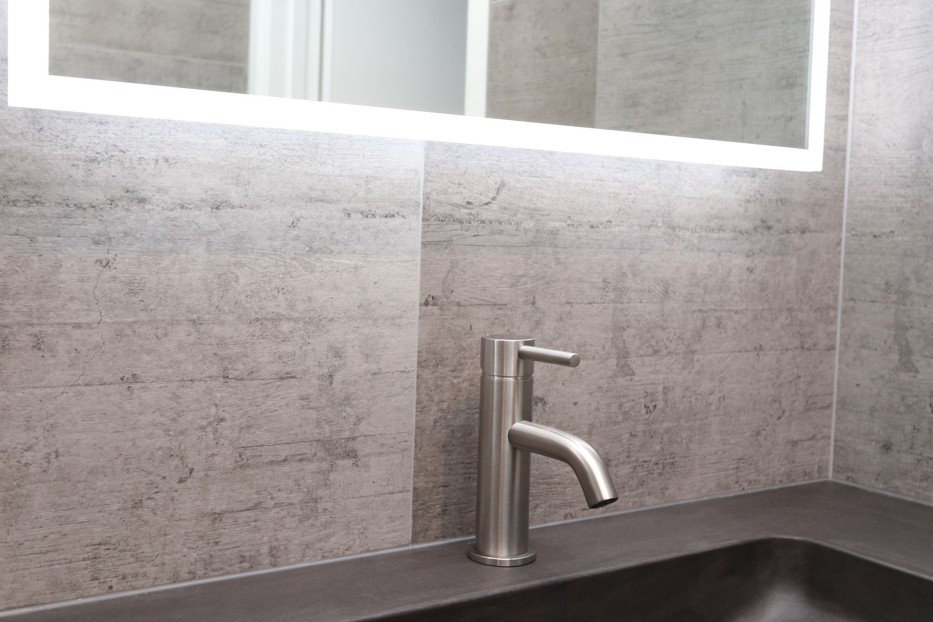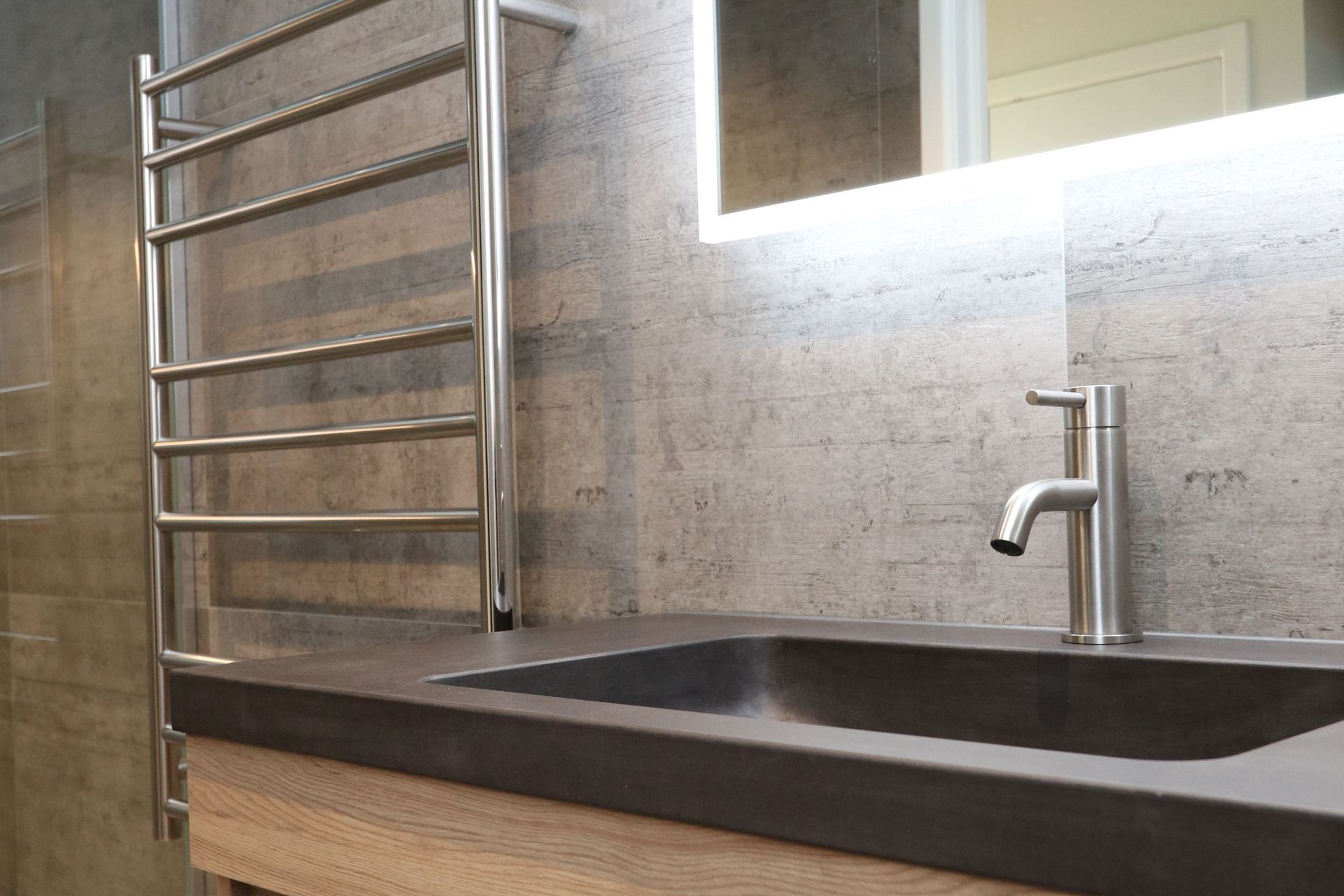 ArchiPro Project Summary - A captivating bathroom featuring a striking blend of cool tiles and warm LED lighting, complemented by a French Oak Velvet vanity and bespoke concrete top, creating a daring and moody space with practical storage solutions.
