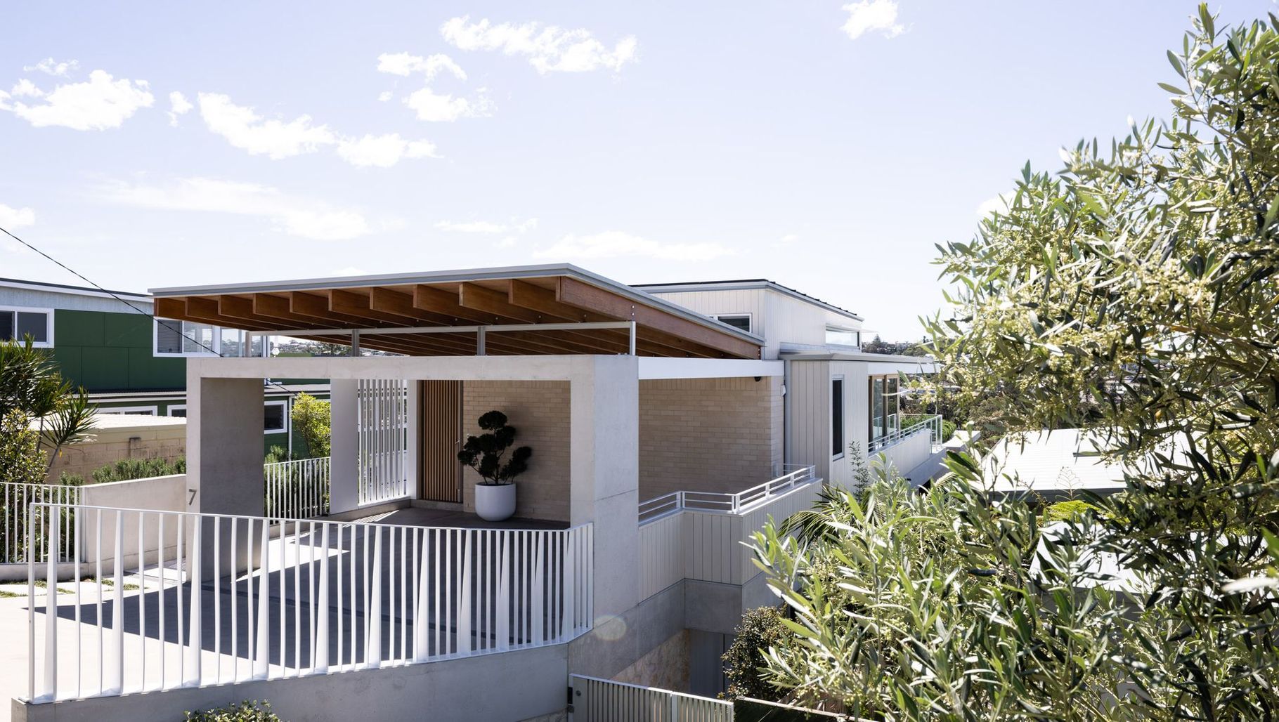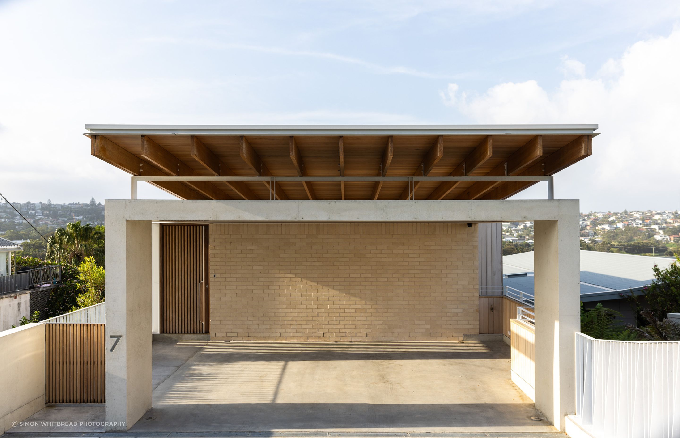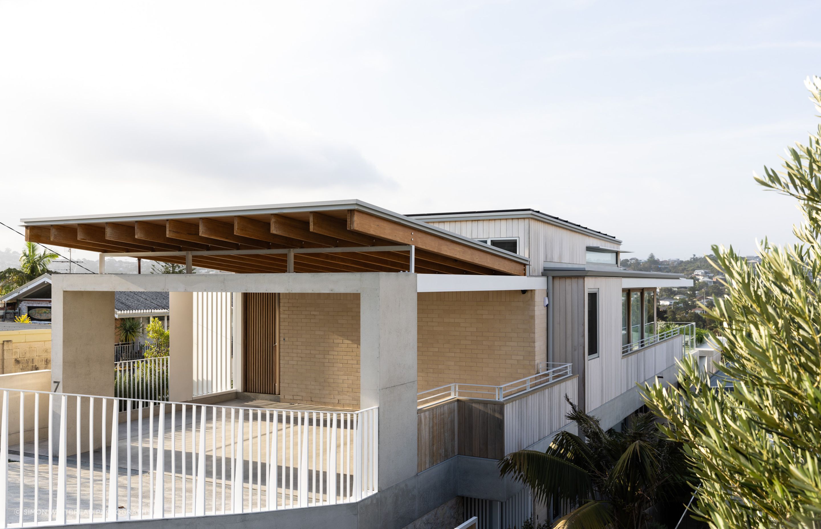 ArchiPro Project Summary - Contemporary multi-level family home featuring a landscaped courtyard, outdoor entertaining pavilion, and swimming pool, completed in 2024, designed to maximize natural light and thermal efficiency in a coastal setting.