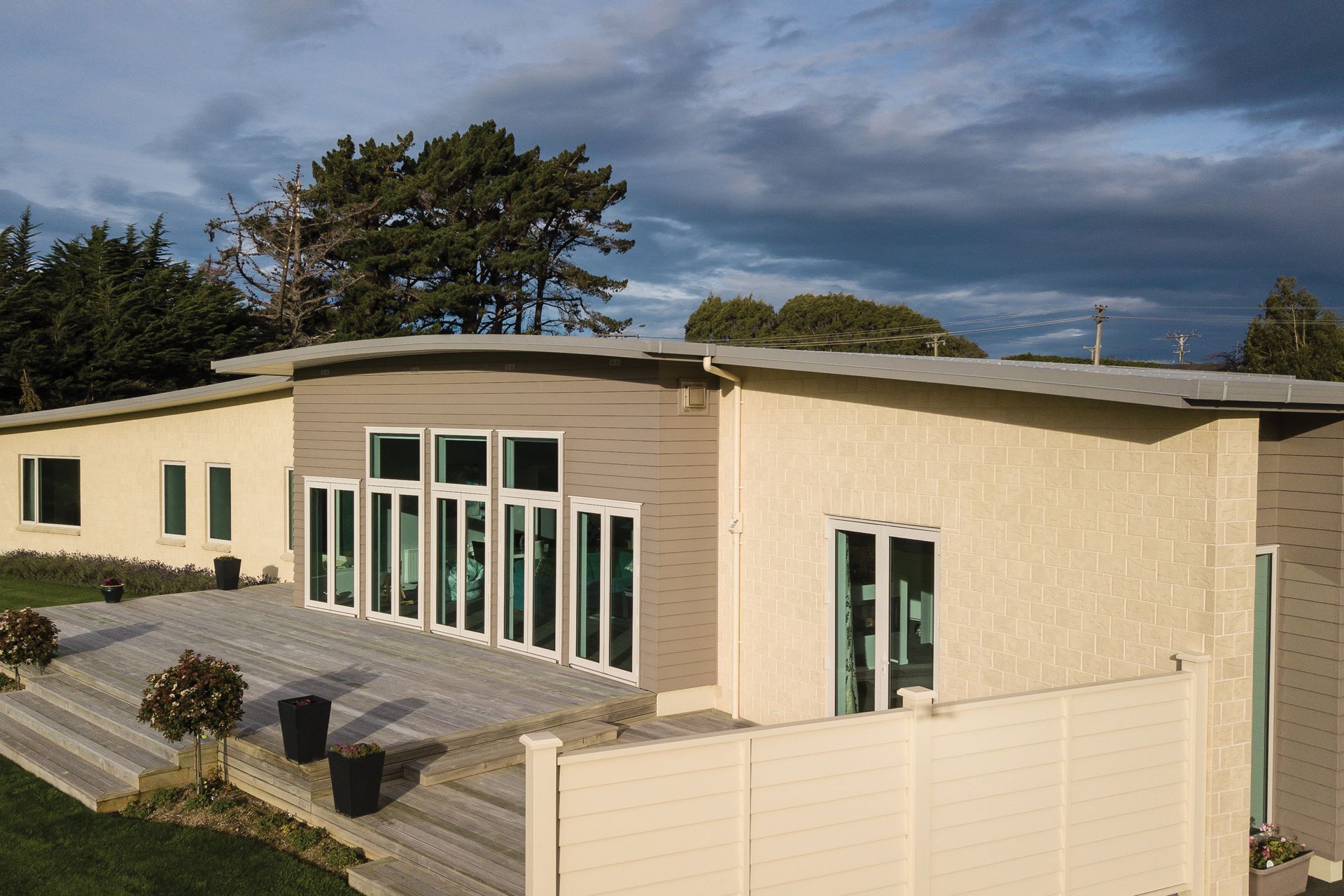 ArchiPro Project Summary - A striking curved residence in Invercargill, designed to harmonize with the Southland landscape while ensuring privacy, shelter, and stunning views, featuring locally sourced materials and innovative roofing solutions.