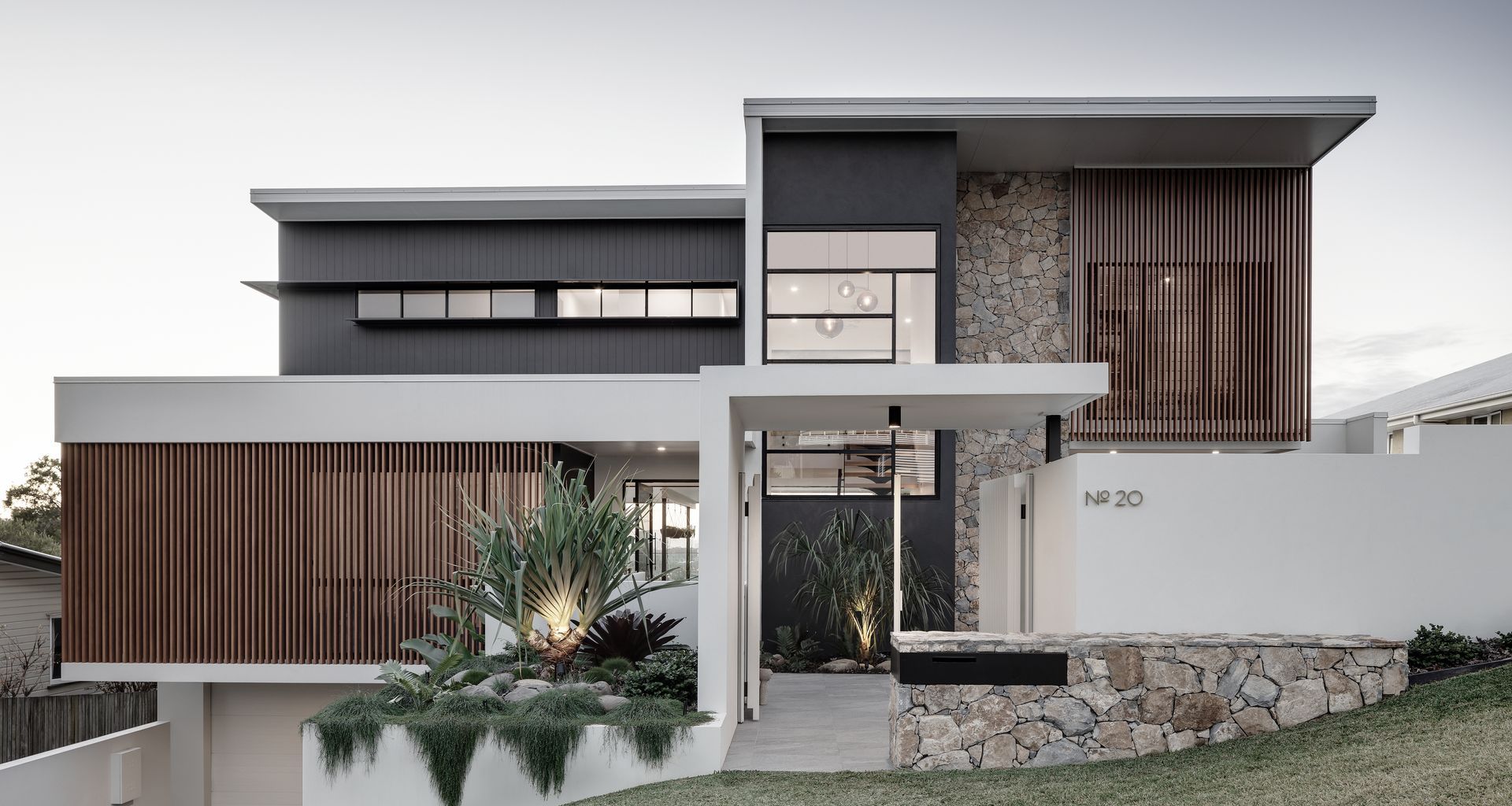 ArchiPro Project Summary - Dagmar Residence: A stunning architectural achievement on a prominent ridge south of Brisbane, featuring breathtaking city views, a thoughtfully designed layout that harmonizes with the natural topography, and a captivating facade of timber and stone.