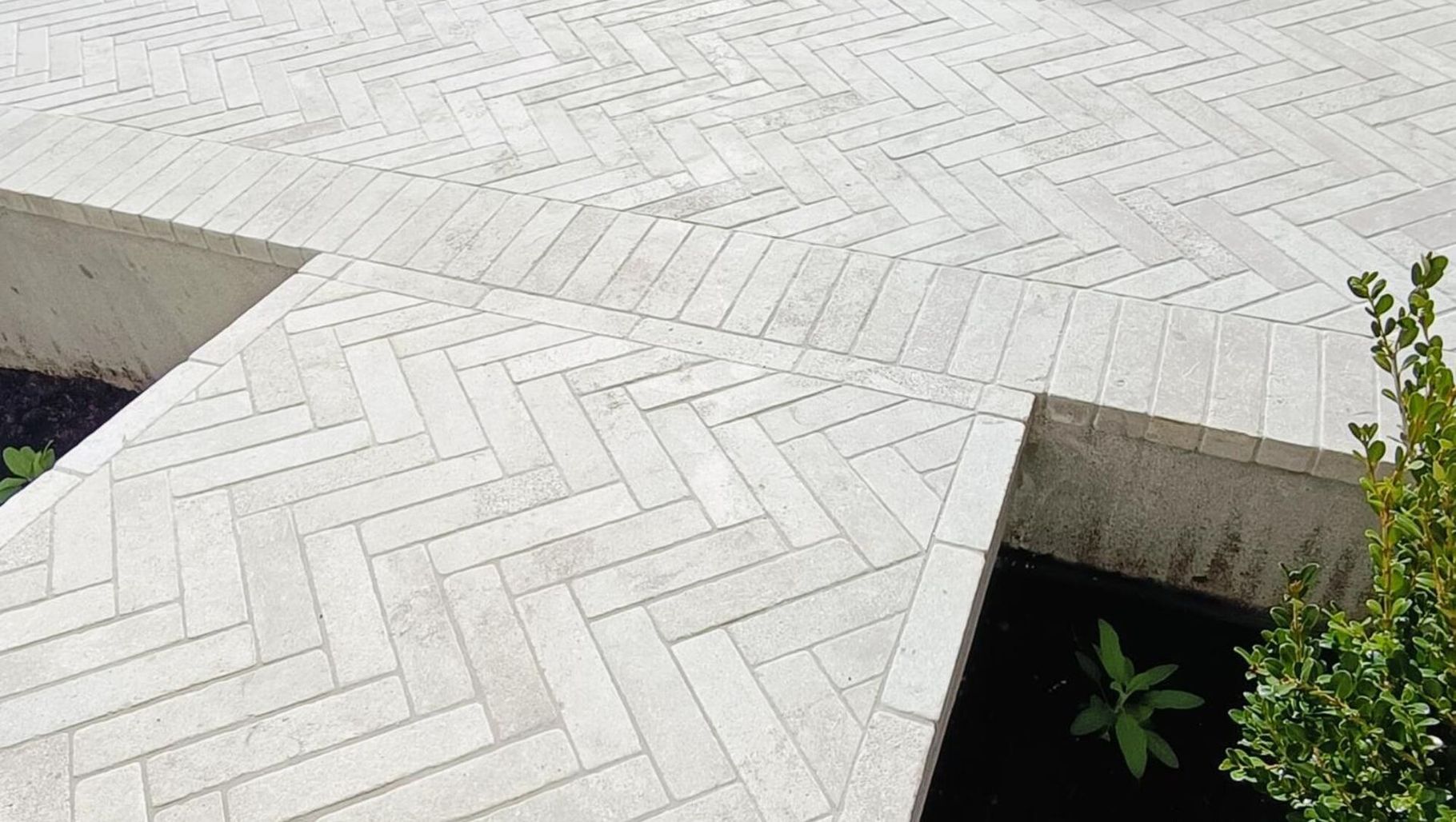 ArchiPro Project Summary - Damn Good Tiling's outdoor landscape project for Ninety45 features sophisticated herringbone patterns and finger tiles, enhancing the Art Deco style building with expert craftsmanship and stunning visual appeal, completed in 2024.
