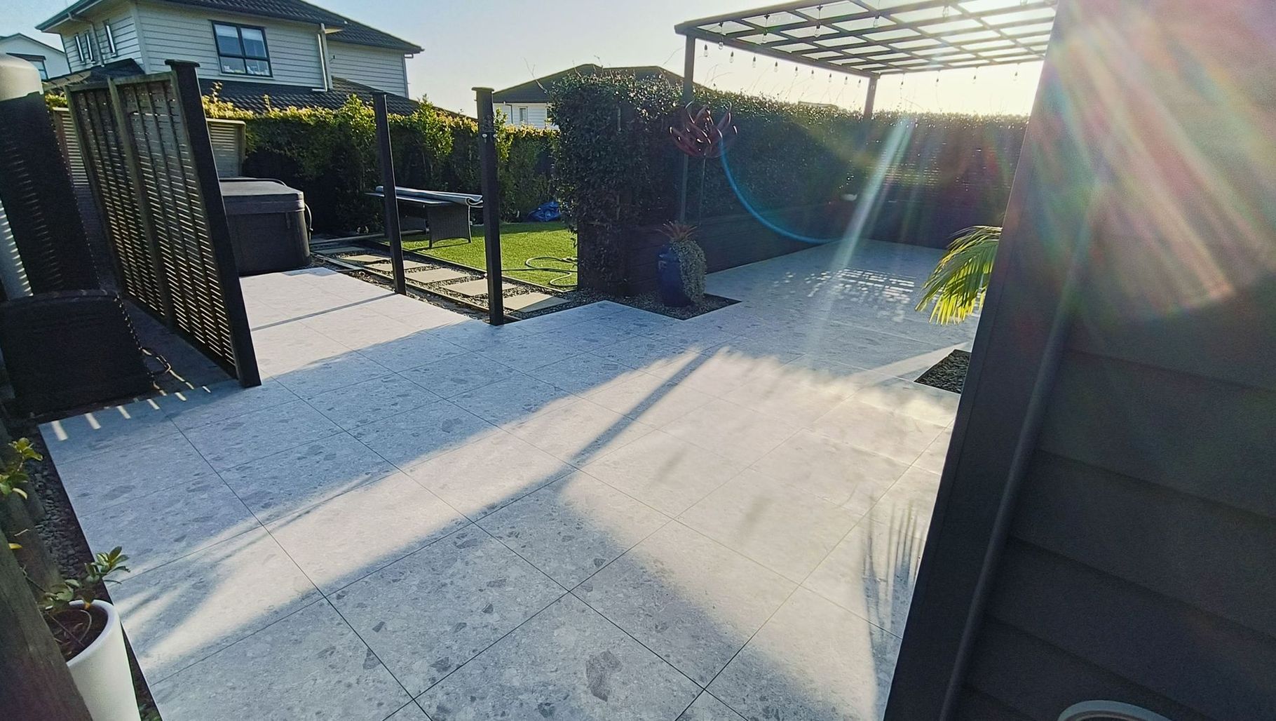 ArchiPro Project Summary - Contemporary outdoor patio transformation featuring high-quality 600x600 tiles, meticulous floor preparation, and expert craftsmanship by Damn Good Tiling, completed in 2024.