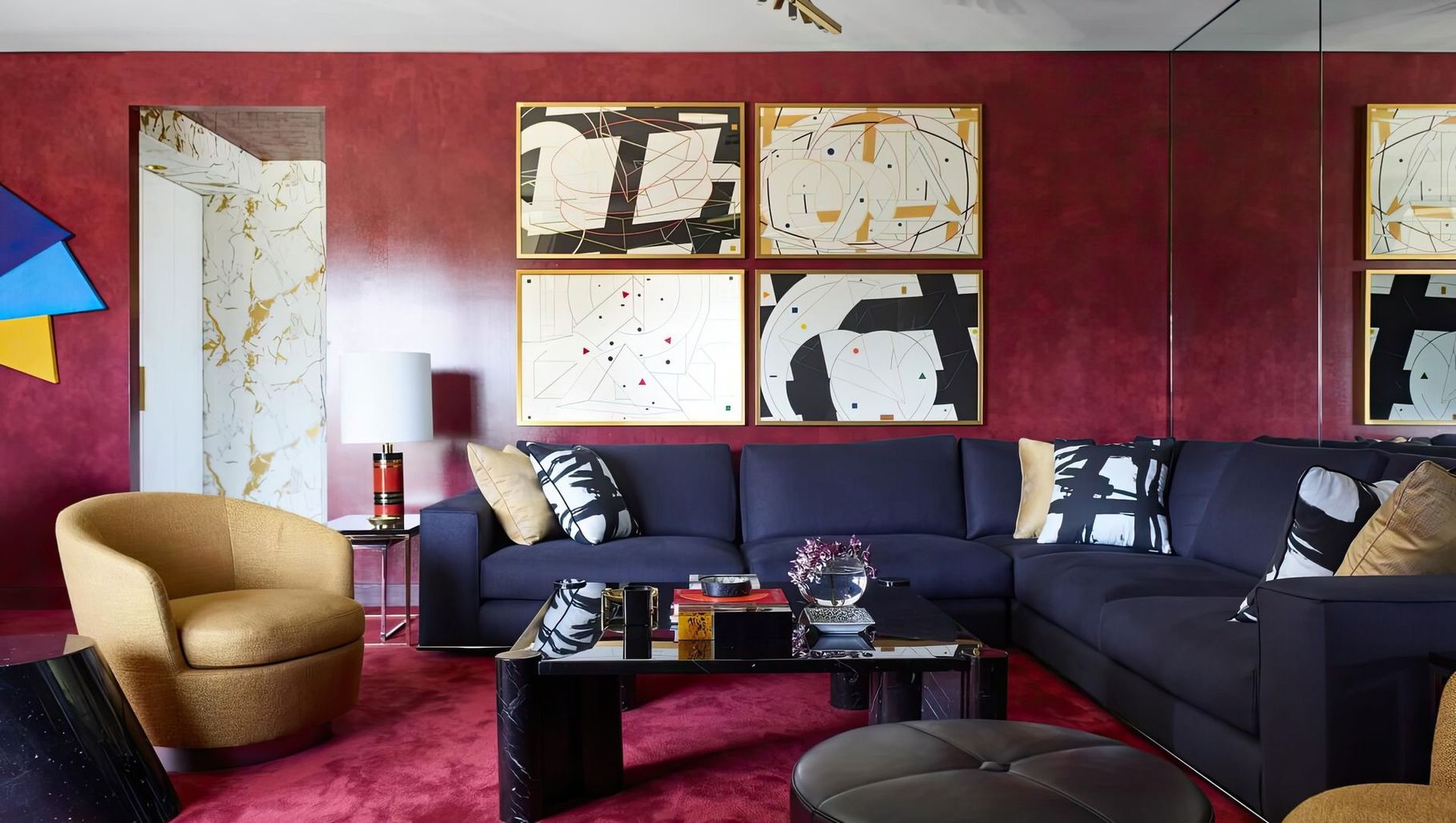 ArchiPro Project Summary - A luxurious interior redesign of Greg Natale's apartment in Sydney's Horizon building, featuring a striking maroon palette, curated art collection, and sophisticated brass accents, creating a moody yet elegant atmosphere that reflects the vibrant harbour city.