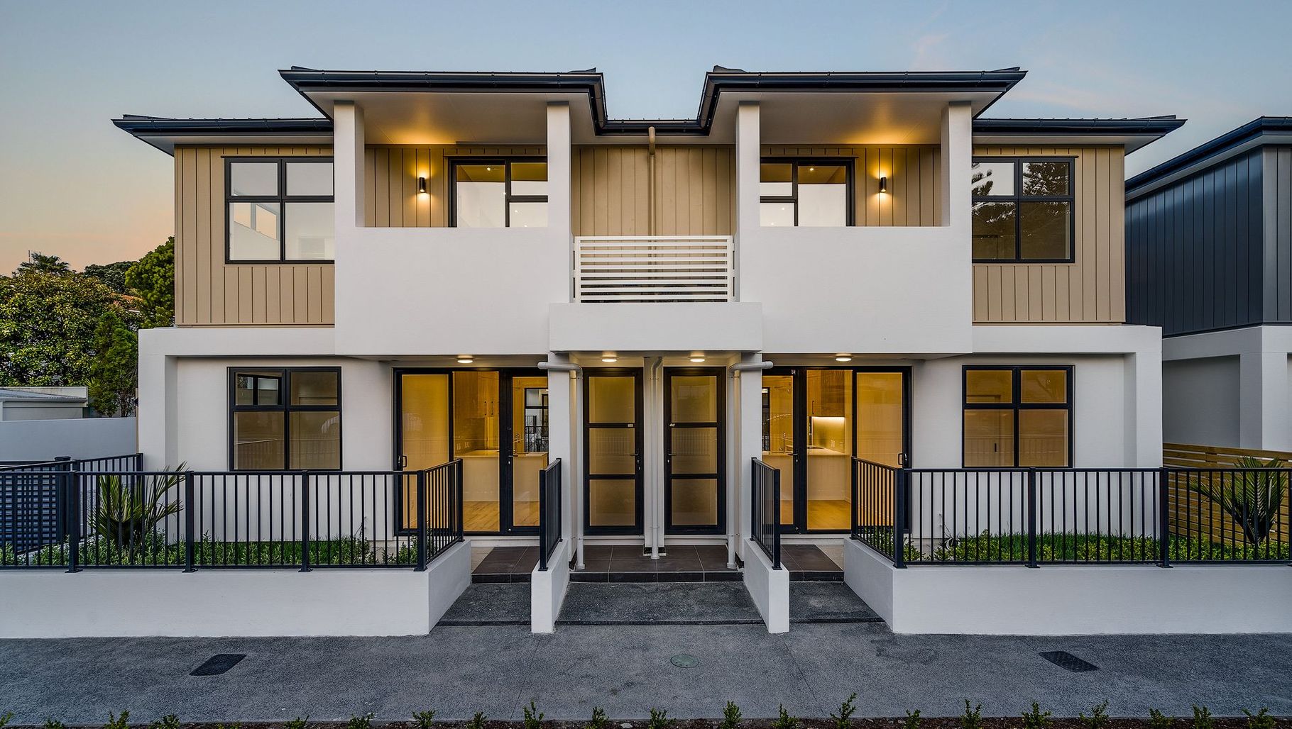 ArchiPro Project Summary - A mixed-type residential development featuring apartments and terrace houses, designed with shared parking to enhance the streetscape and individual balconies for each unit, completed in 2019 in Orewa, Auckland, New Zealand.