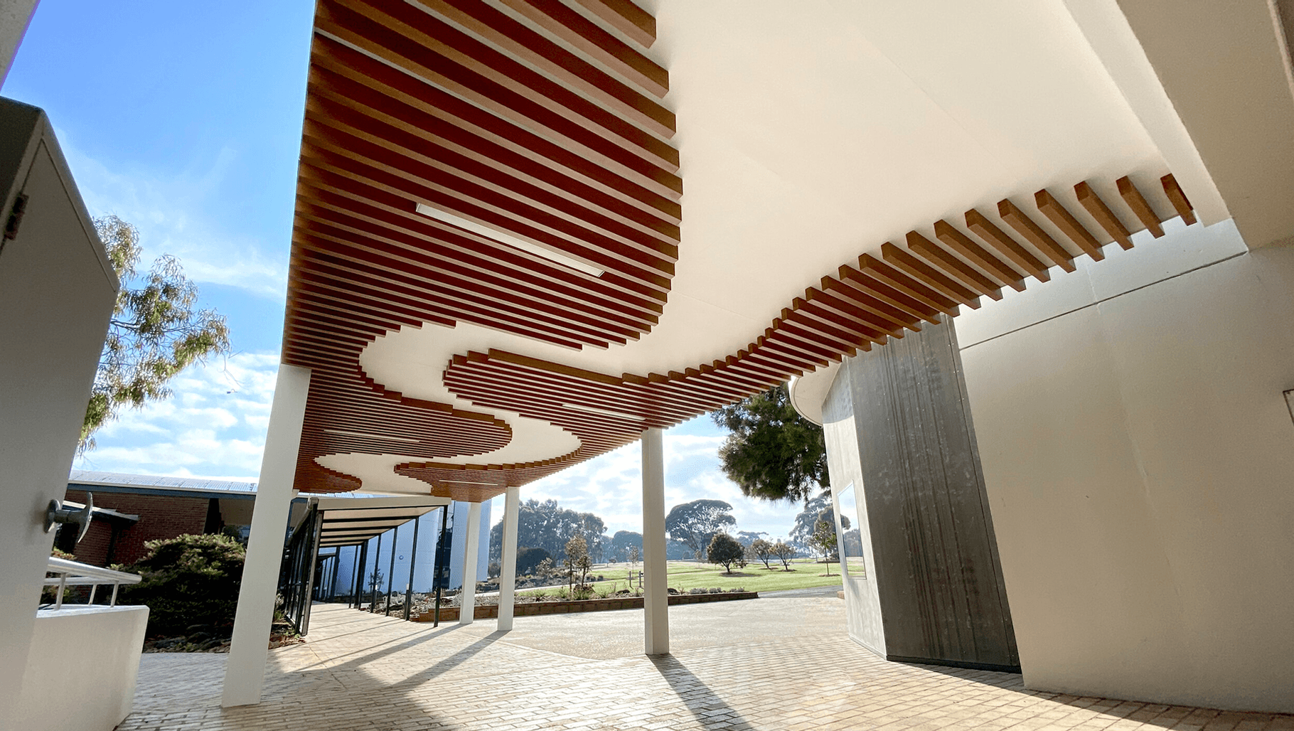 ArchiPro Project Summary - Deakin Canopy features a striking soffit lining with timber look battening inspired by the local rivers, creating a visually engaging entryway that invites users to dream and imagine, embodying the essence of a university space in Warrnambool, Victoria.