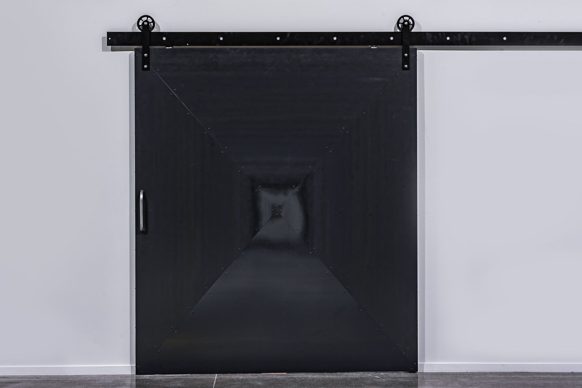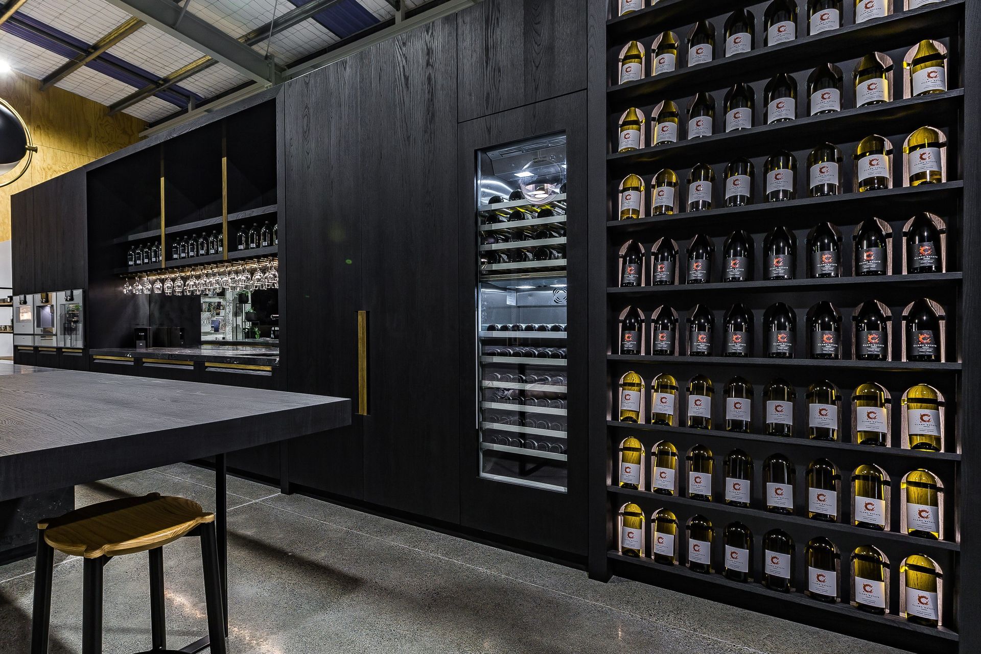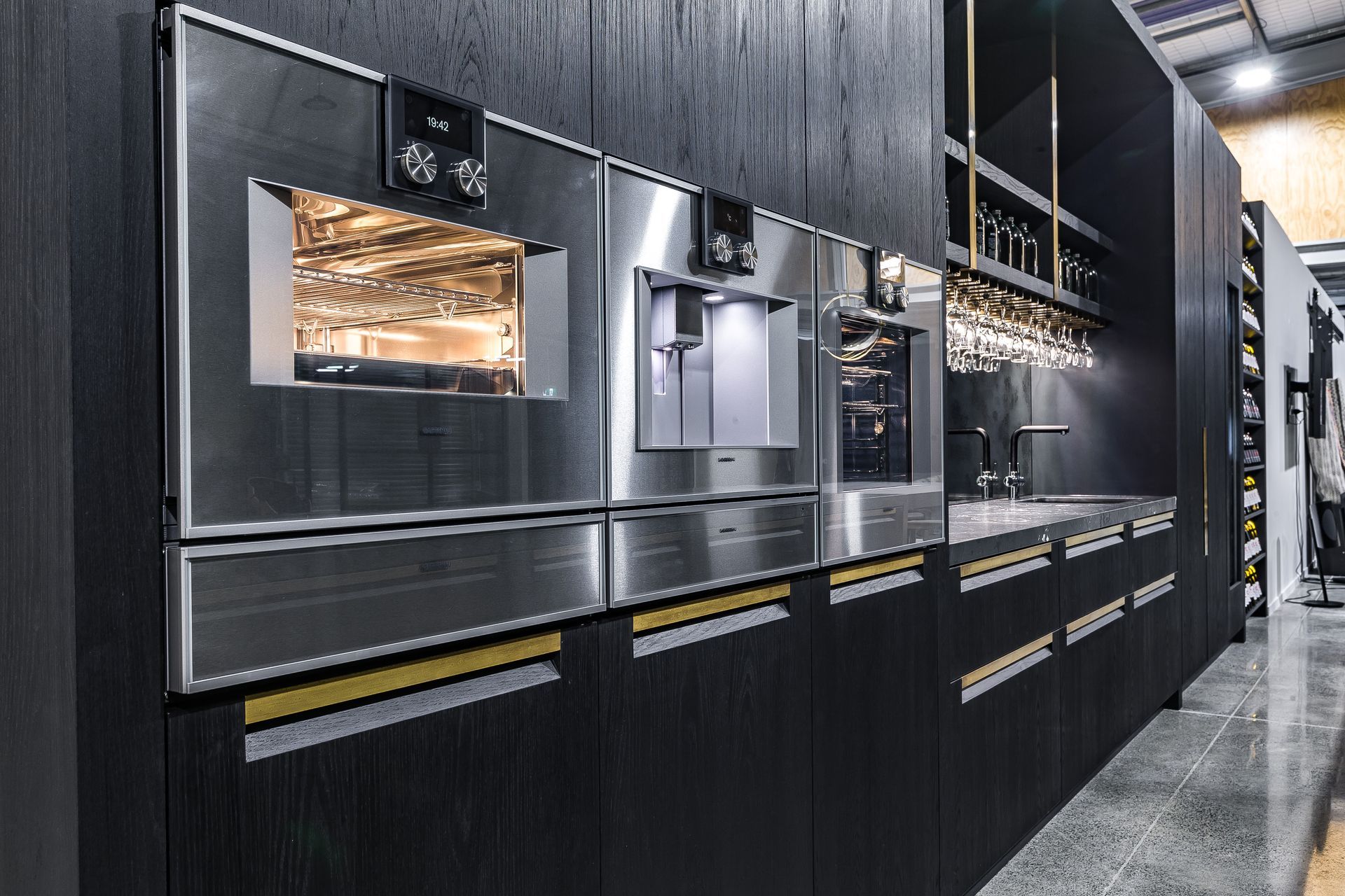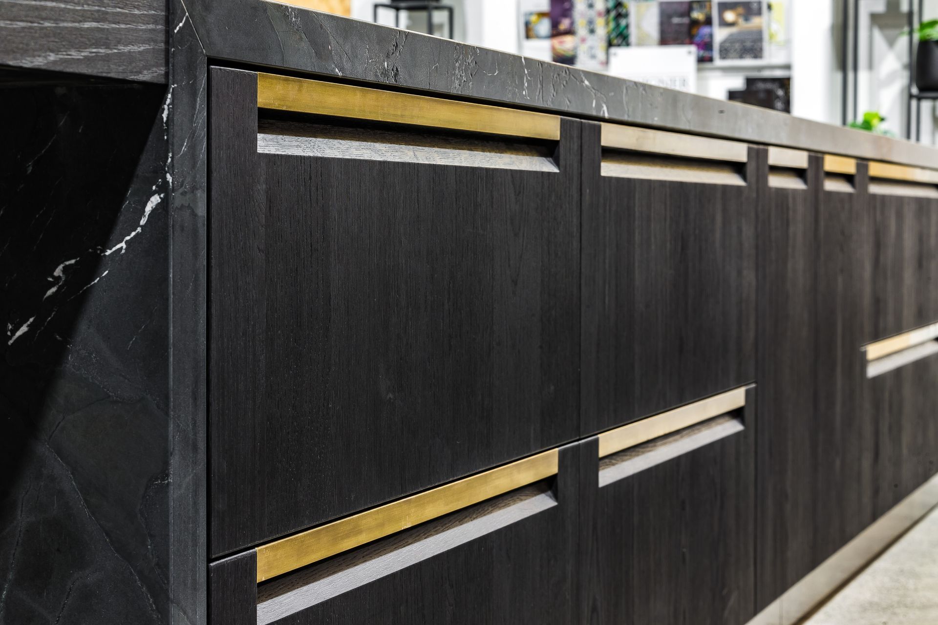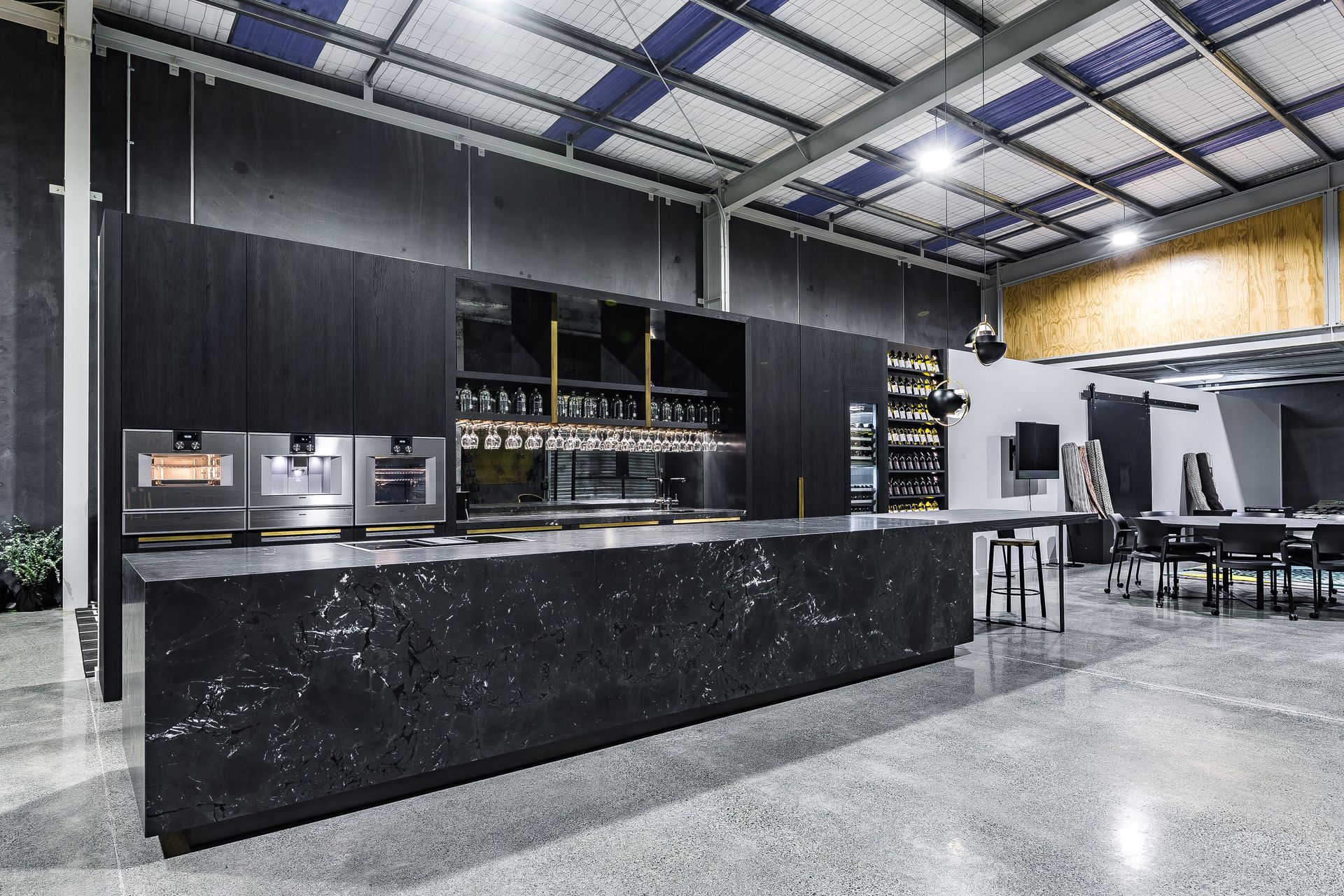 ArchiPro Project Summary - A stunning DBJ kitchen design in the Designer Rugs showroom, featuring custom brass handles, planked oak finishes, and a striking blackened steel barn door, showcasing exceptional craftsmanship and innovative design elements.