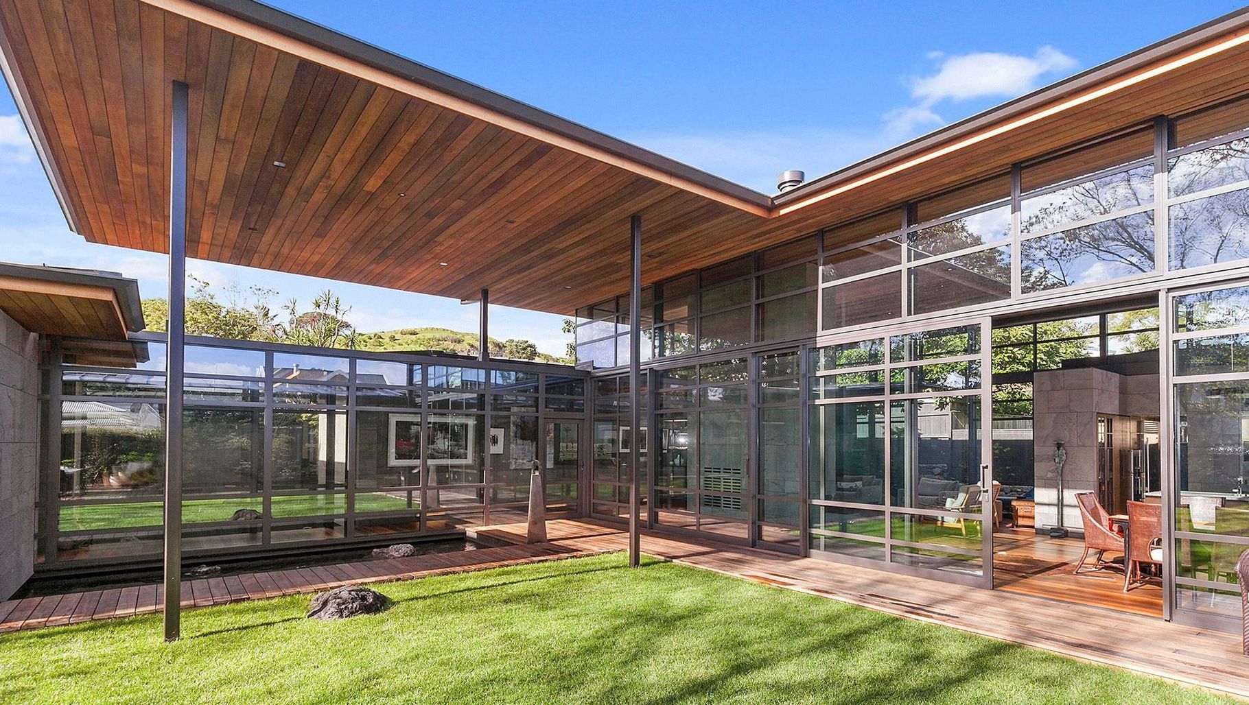 ArchiPro Project Summary - The Devonport Home features a landscaped estate with a serene garden, well-maintained lawn, and a stylish fence for privacy.