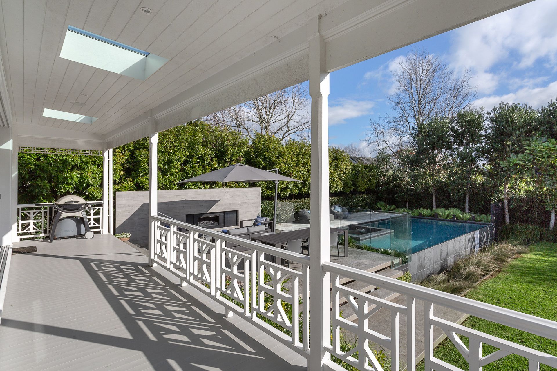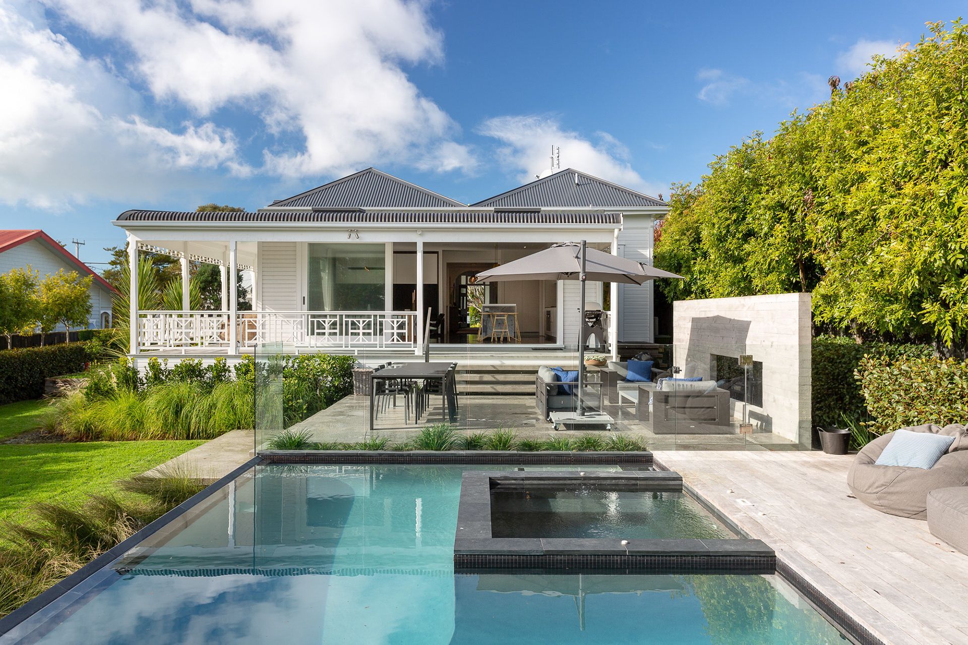 ArchiPro Project Summary - A harmonious blend of historic charm and contemporary design, featuring a renovated villa front and a modern rear extension with spacious living areas, a scullery, and a transformed outdoor space with a terrace, pool, and expansive lawn.
