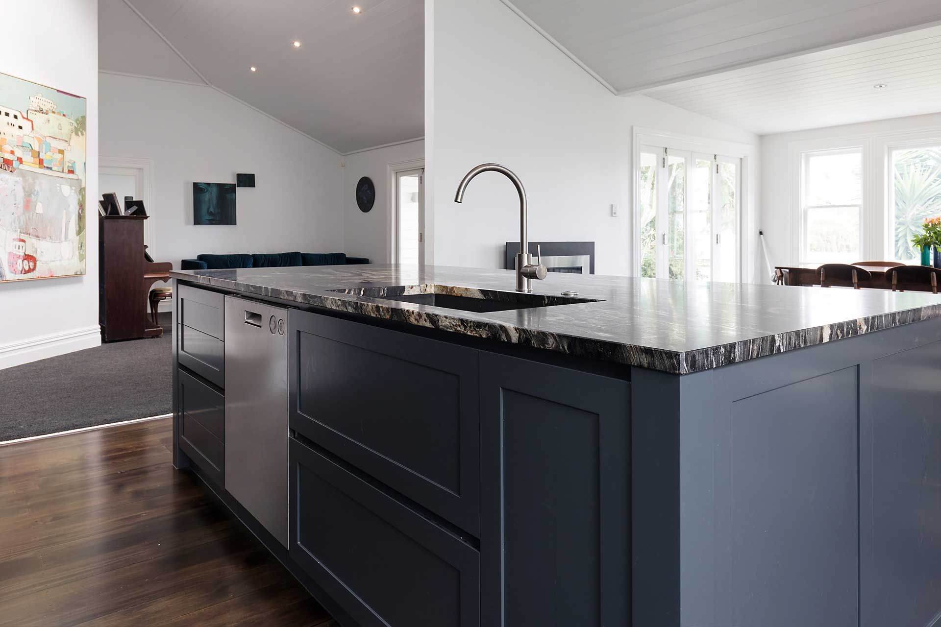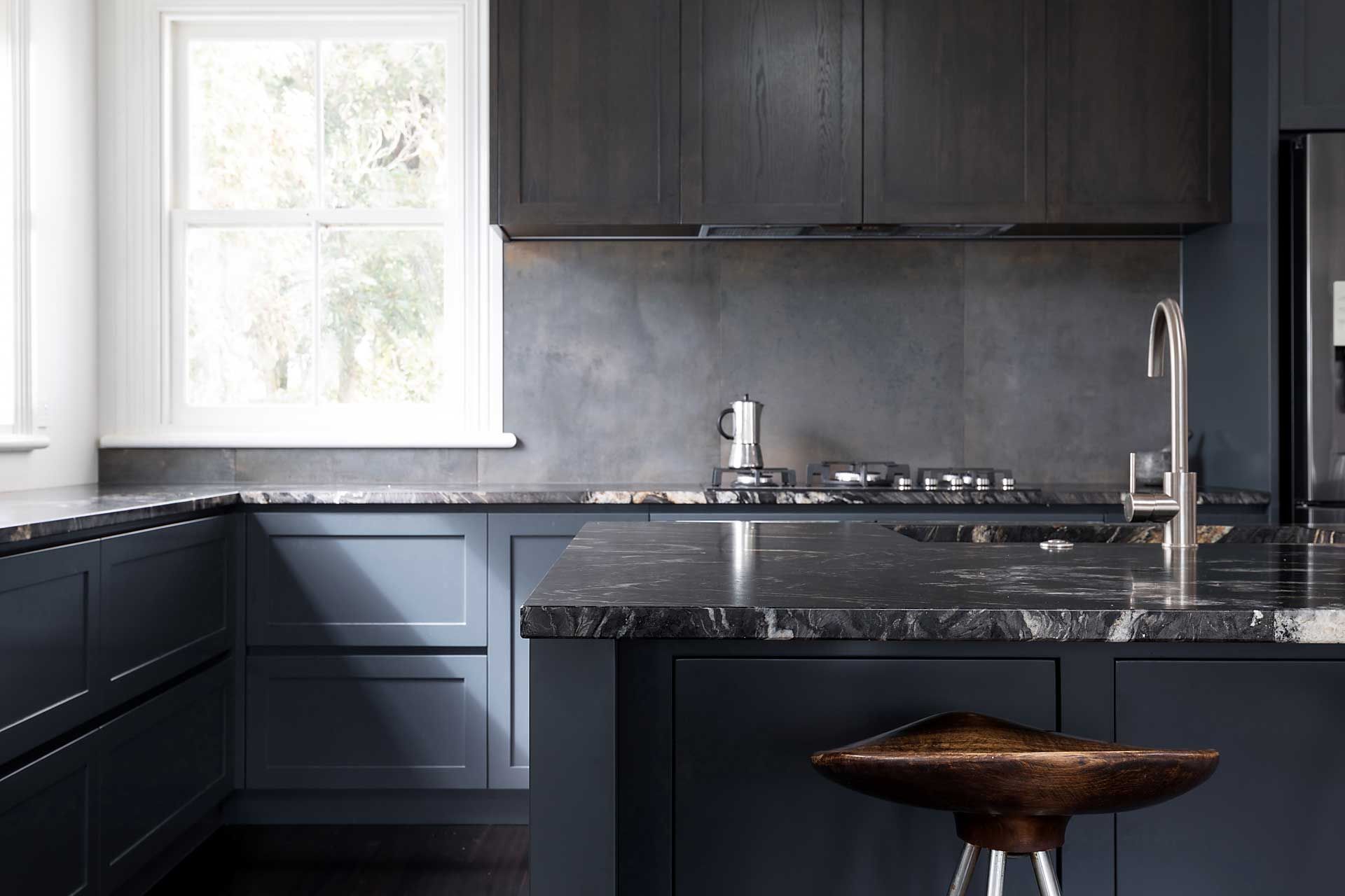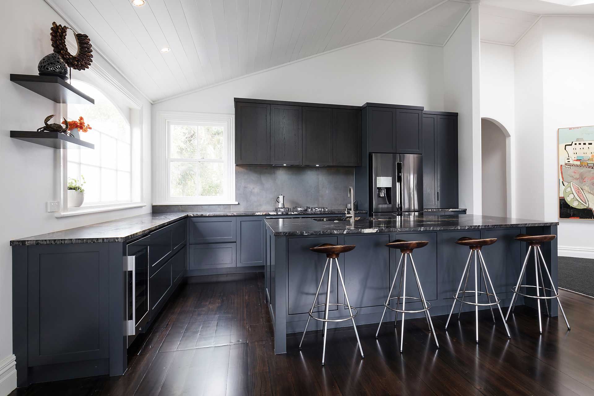 ArchiPro Project Summary - A contemporary kitchen renovation in a classic Devonport villa, featuring dark-stained timber, deep grey panels, and honed titanium granite benchtops, designed by Neo Design to harmonize traditional aesthetics with modern functionality.