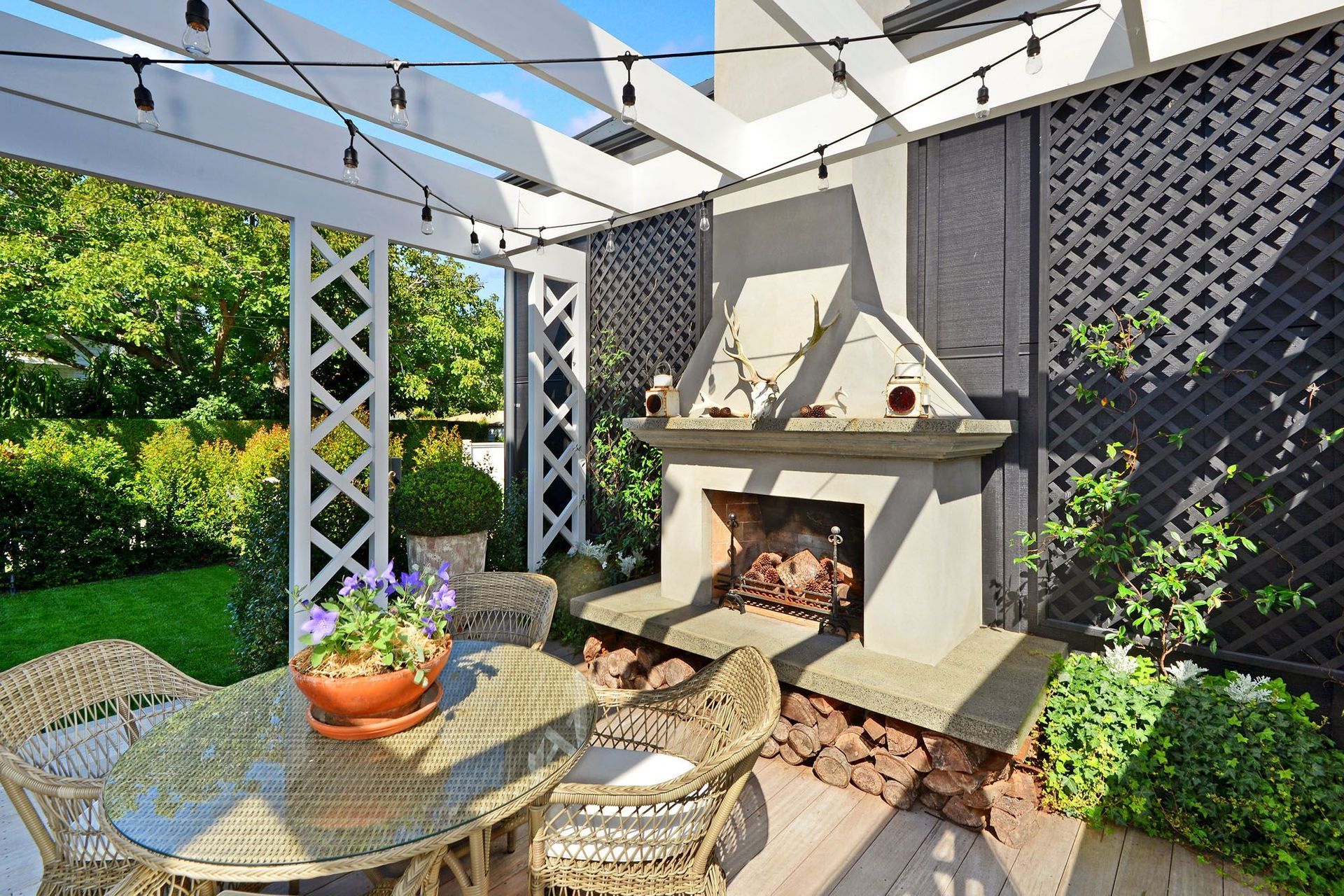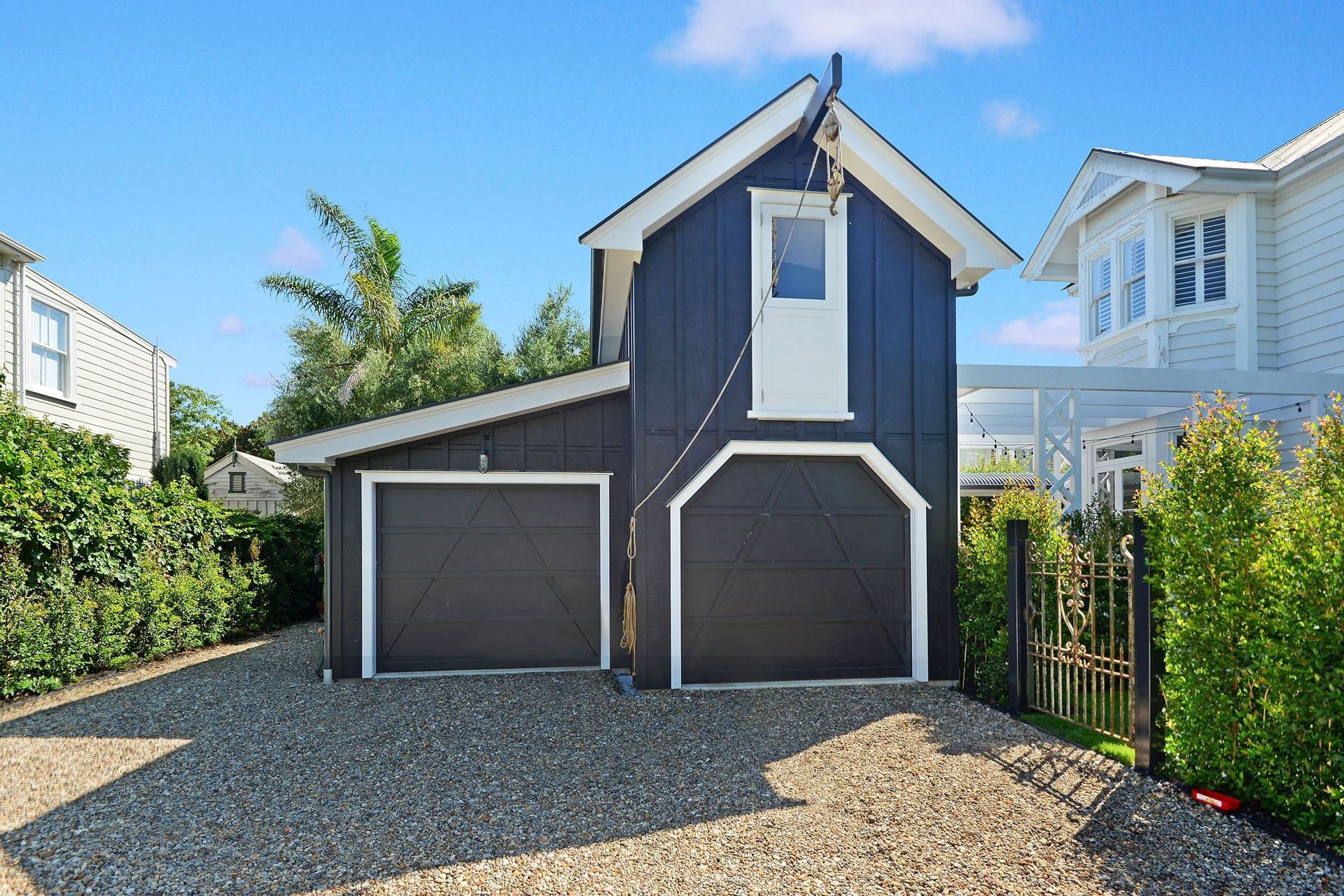 ArchiPro Project Summary - New barn-style garage and loft with an outdoor living space featuring a fireplace and deck, seamlessly connecting to the existing Devonport villa home.