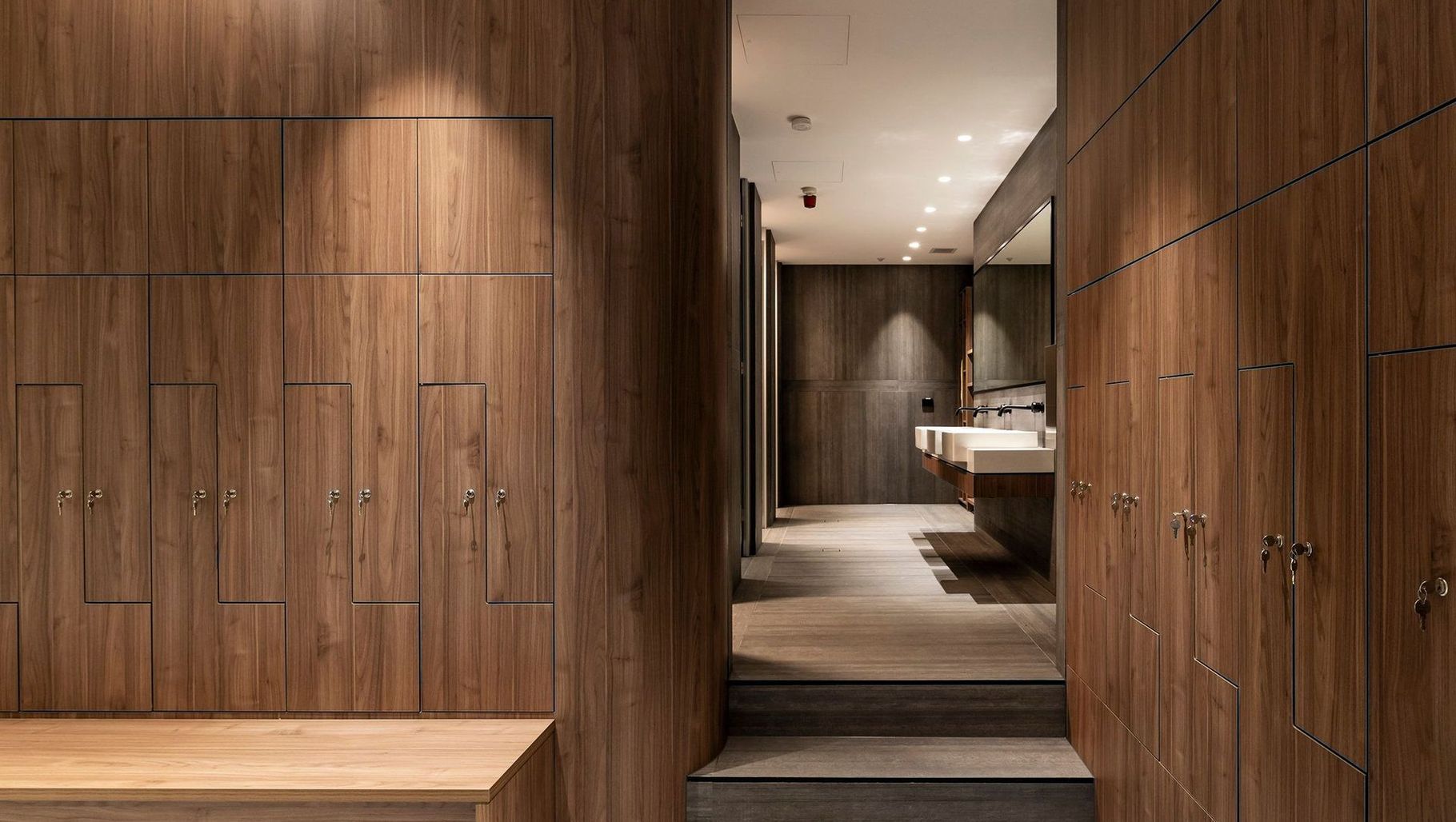 ArchiPro Project Summary - Dolby Australia Head Office: A transformative End of Trip Facility inspired by Scandinavian thermal baths, featuring warm walnut timber and concrete look tiles, designed to create a spa-like atmosphere for employees in just 5 weeks.