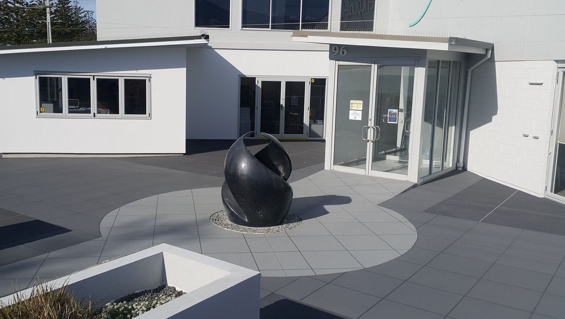 ArchiPro Project Summary - Revitalization of Encounter Kaikoura's entranceway with Permacolour Decorative Flooring Overlay, featuring a blend of granite grey, charcoal, and misty grey finishes, enhanced by Permacolour Concrete Sealer Extra for durability and aesthetic appeal.