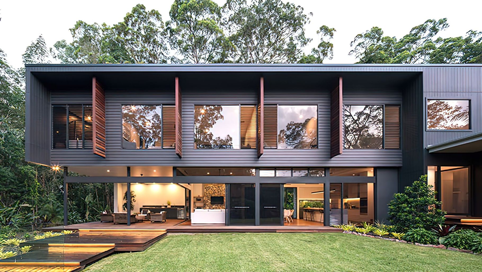 ArchiPro Project Summary - Contemporary home in Noosa Hinterland featuring earthy materials, extensive glazing, and a seamless indoor-outdoor living experience, designed to replace a previous structure, completed in 2018 and awarded for excellence in custom home design.