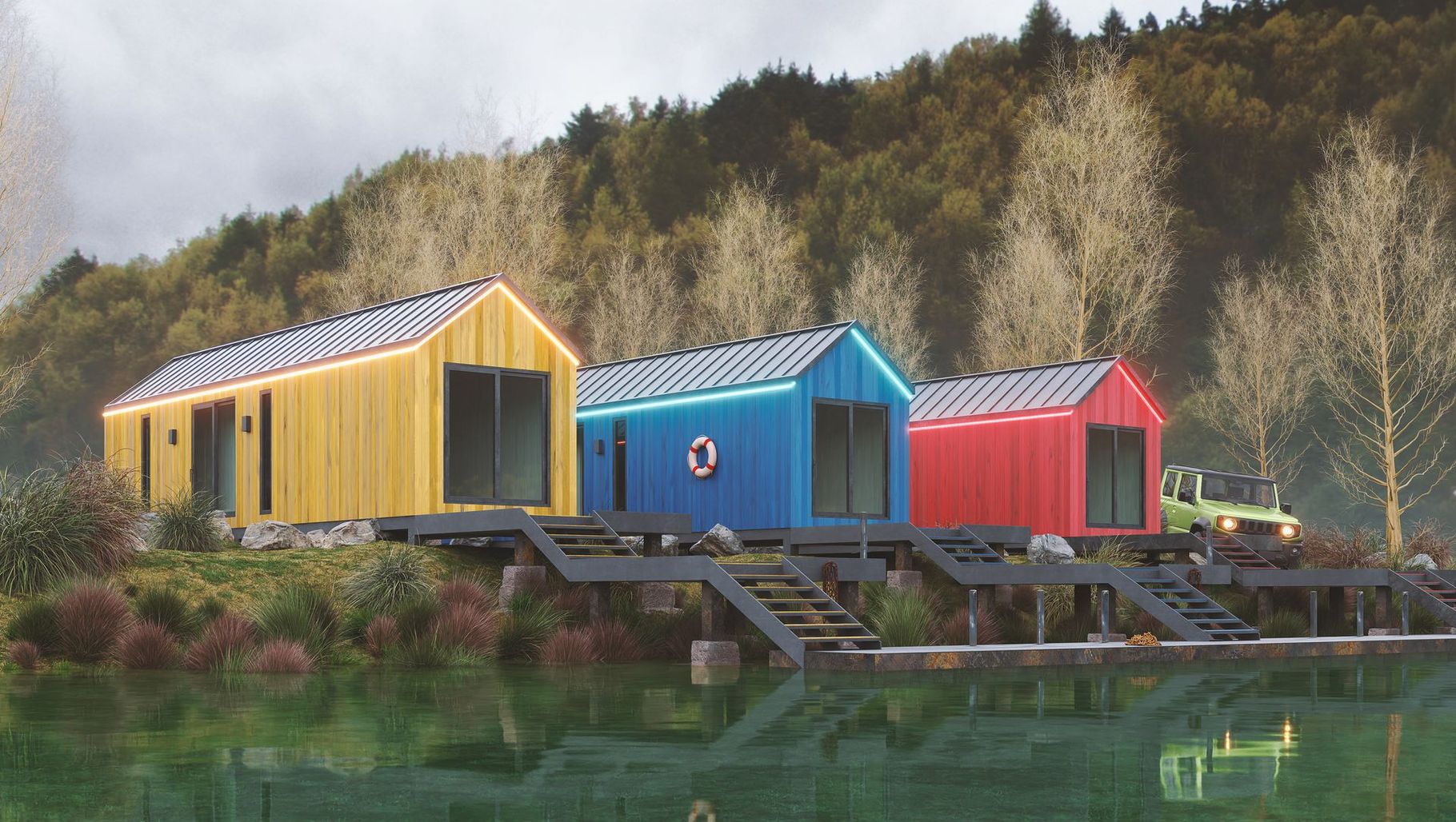 ArchiPro Project Summary - A nostalgic tourist hub at Dunstan Lake featuring relocatable cabins with ensuite, kitchen, and dining areas, designed with colorful wood planks reminiscent of 60s beach cabins, offering a serene retreat for water sports enthusiasts.