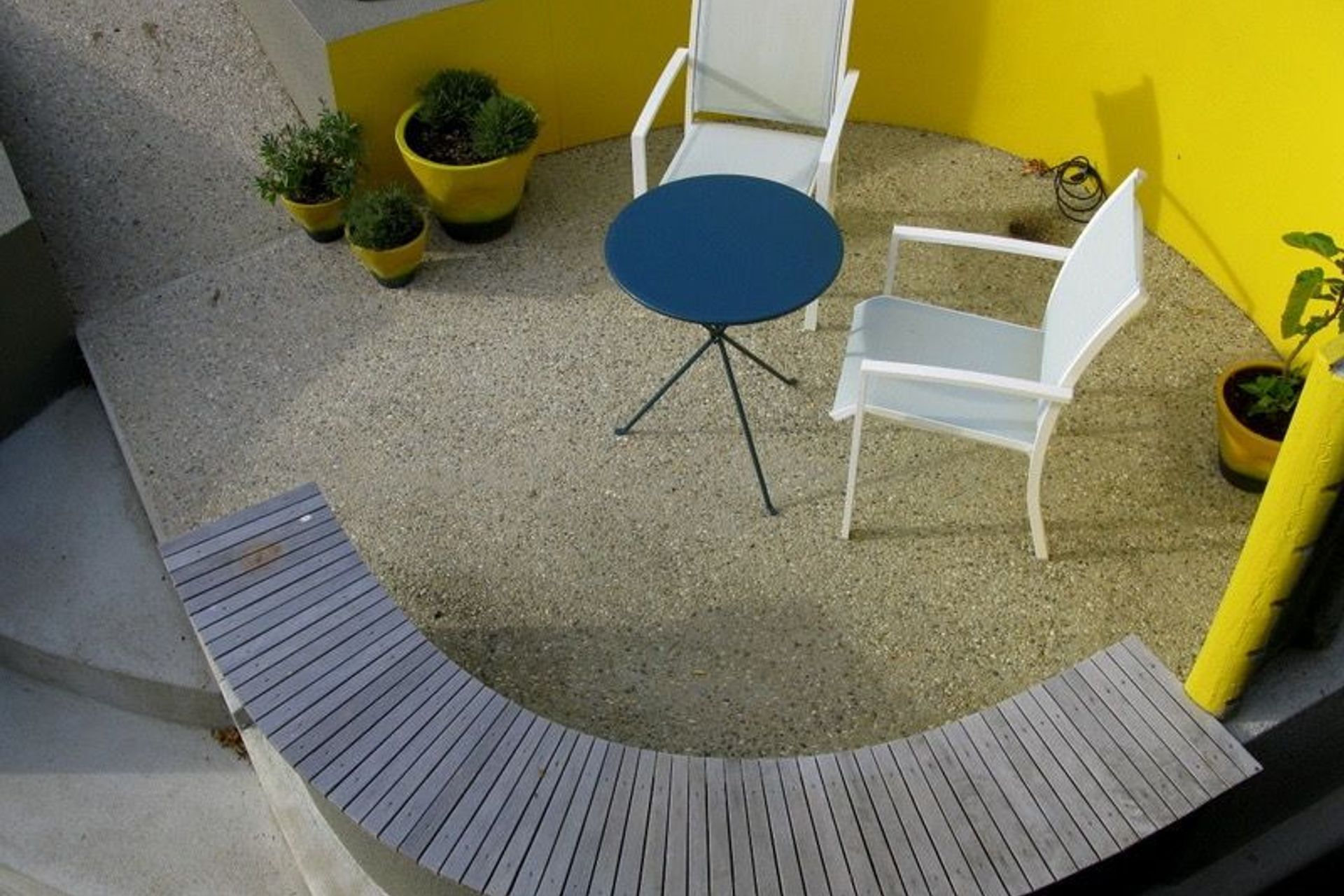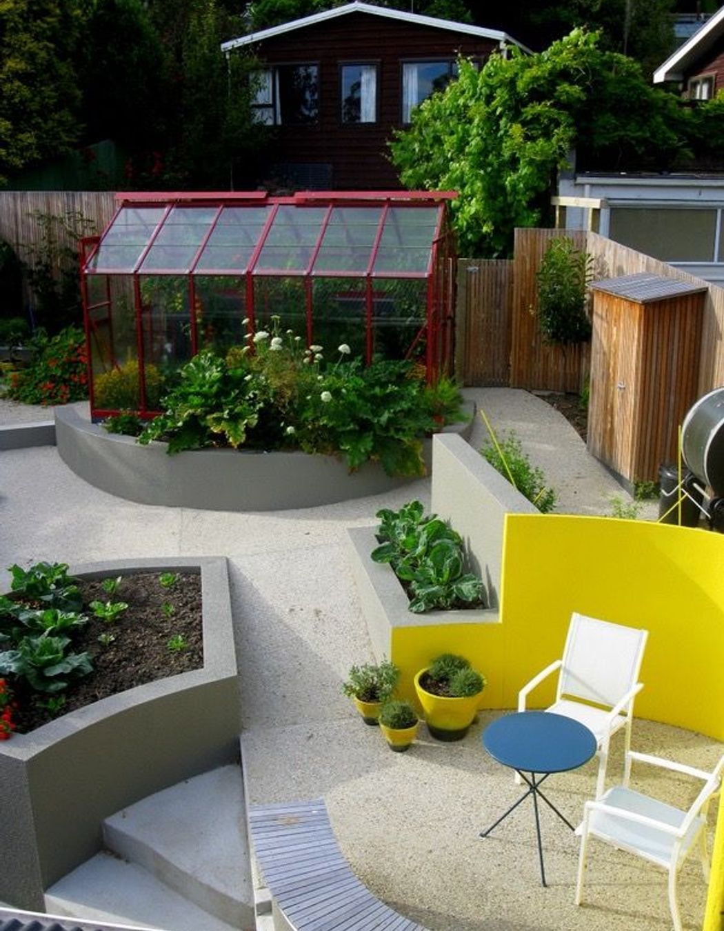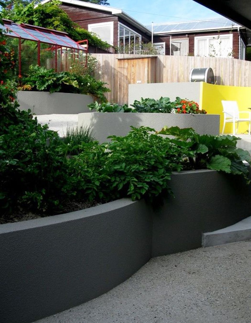 ArchiPro Project Summary - Innovative edible garden design featuring sculptural concrete walls and paths, vibrant color accents, and accessible ramped access on a steep slope, creating a functional and engaging kitchen garden space.