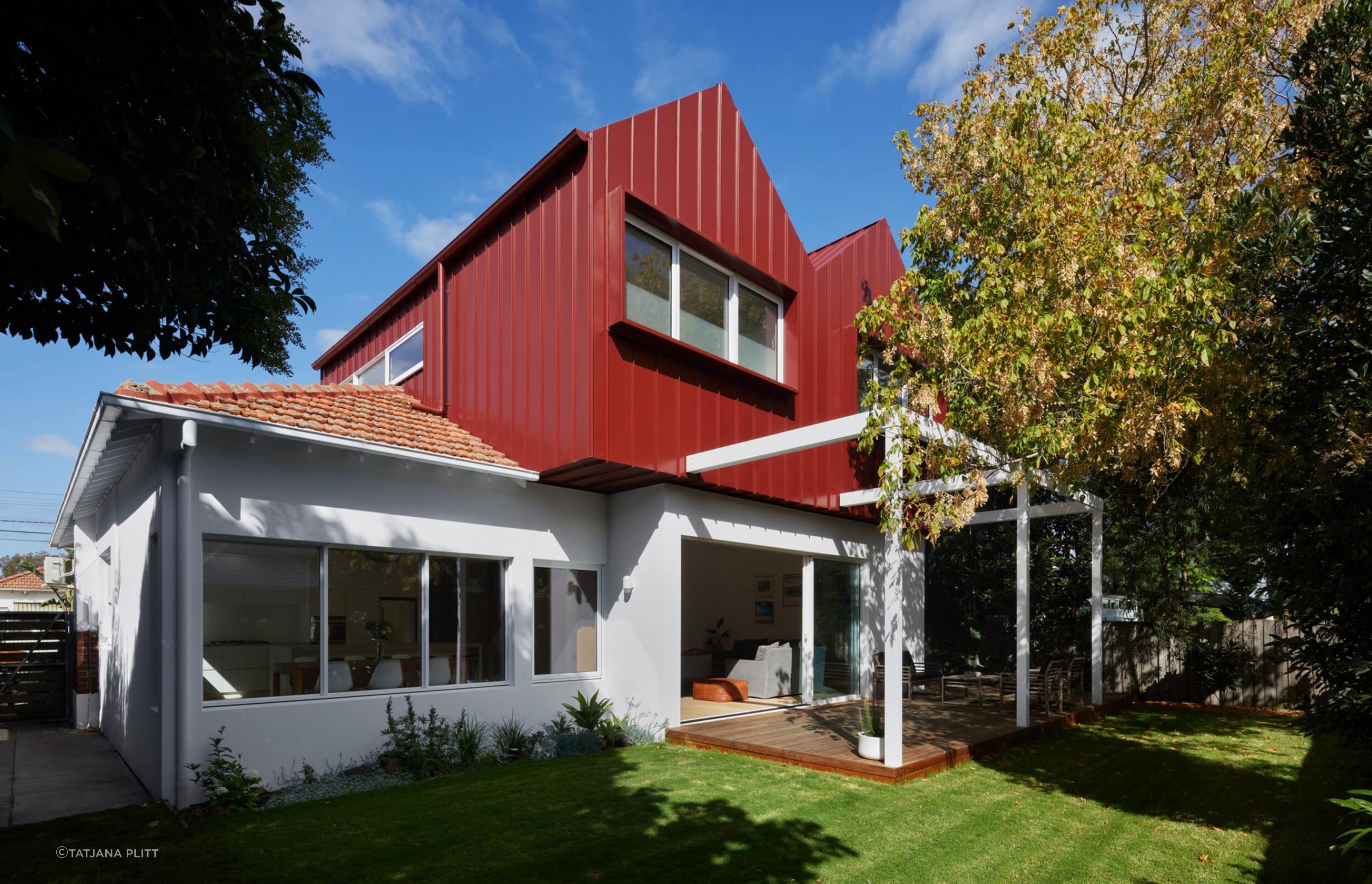 ArchiPro Project Summary - Contemporary extension and first floor addition to a Californian Bungalow, featuring a unique tree house design with two bedrooms and a rumpus, complemented by striking manor red cladding and nestled within a lush tree canopy.