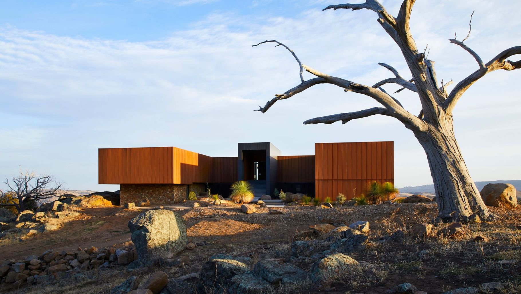 Taking inspiration from Ned Kelly's infamous last stand, this monumental home perfectly captures a spirit of defiance, optimising its powerful, sentry-like location within the vastness of the surrounding Australian landscape.