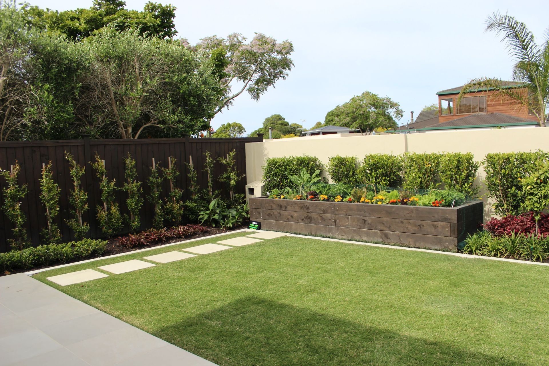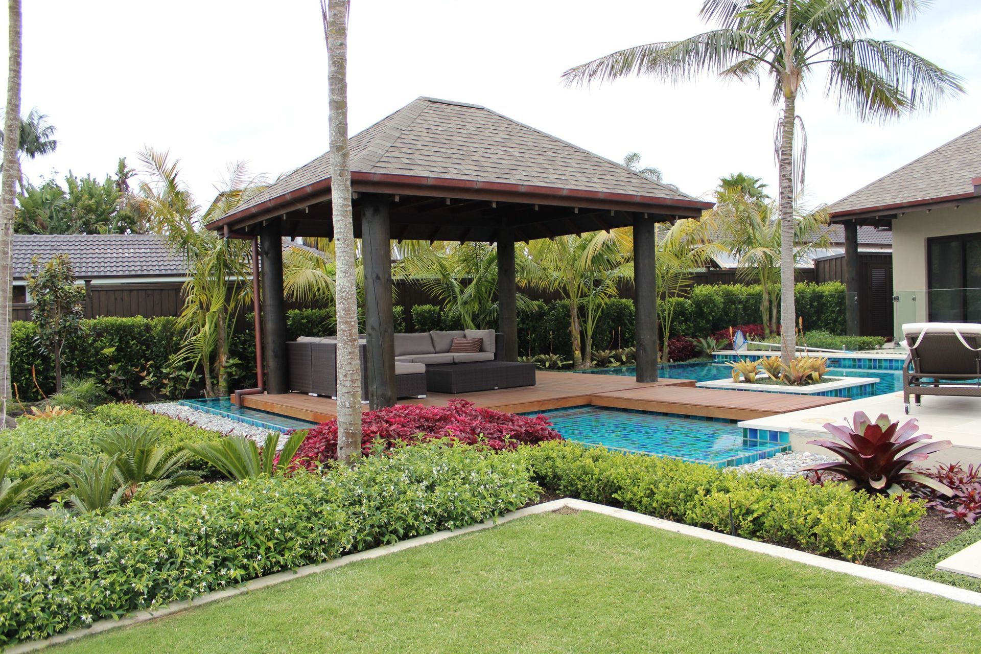 ArchiPro Project Summary - Coastal garden featuring tropical plants, a resort-style pool with a central Bale, and a harmonious blend of color and texture in the planting scheme.