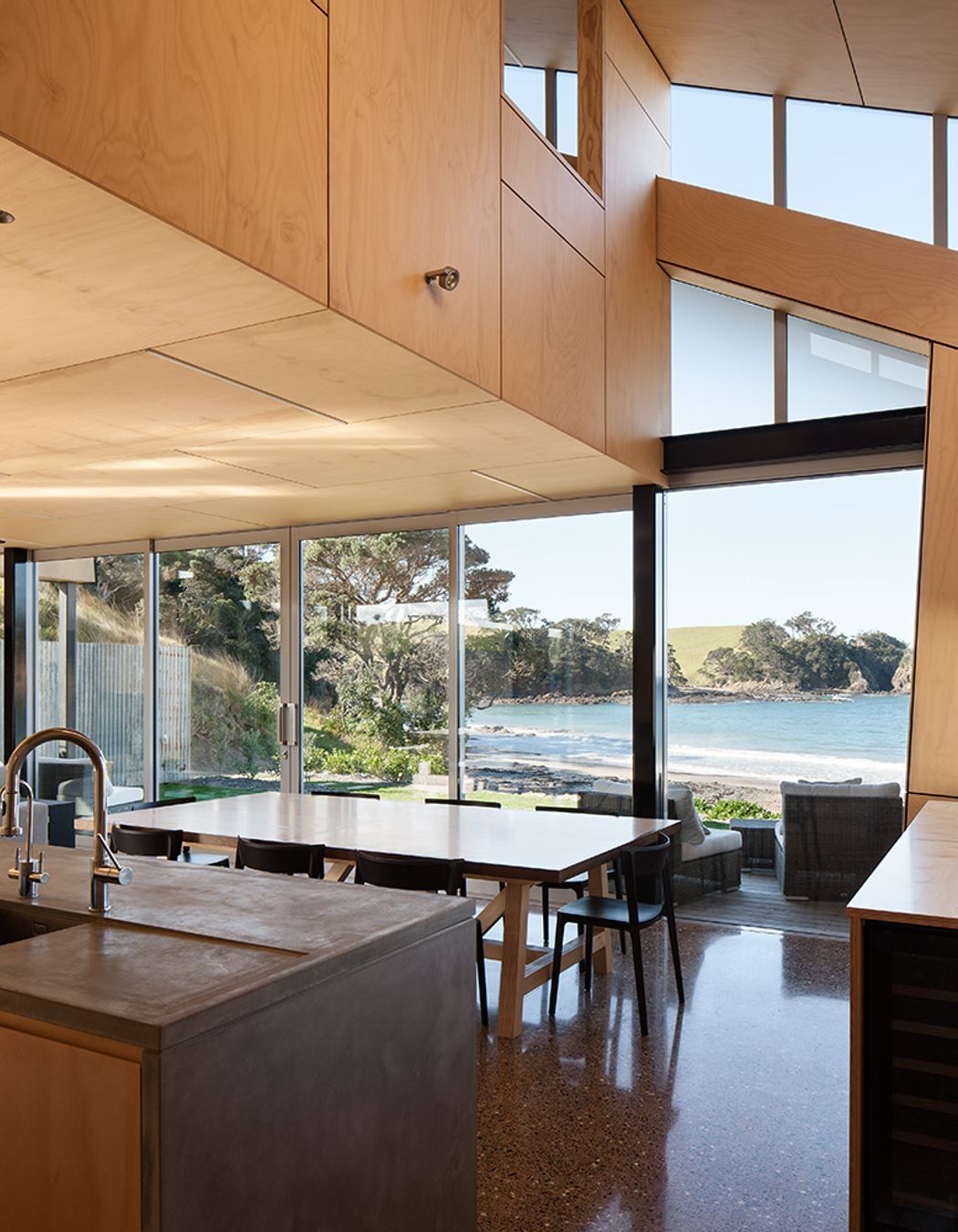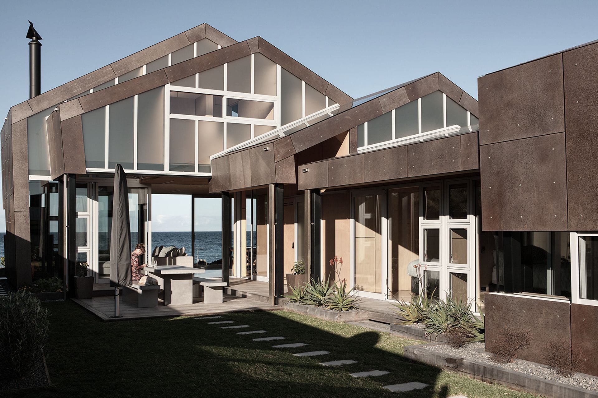 ArchiPro Project Summary - Fe3O4 House: A contemporary coastal retreat in Taiharuru Bay, designed by Crosson Architects, featuring a protective vessel form, innovative Fe304 cladding, and sustainable elements, all while maintaining privacy and a strong connection to the ocean.