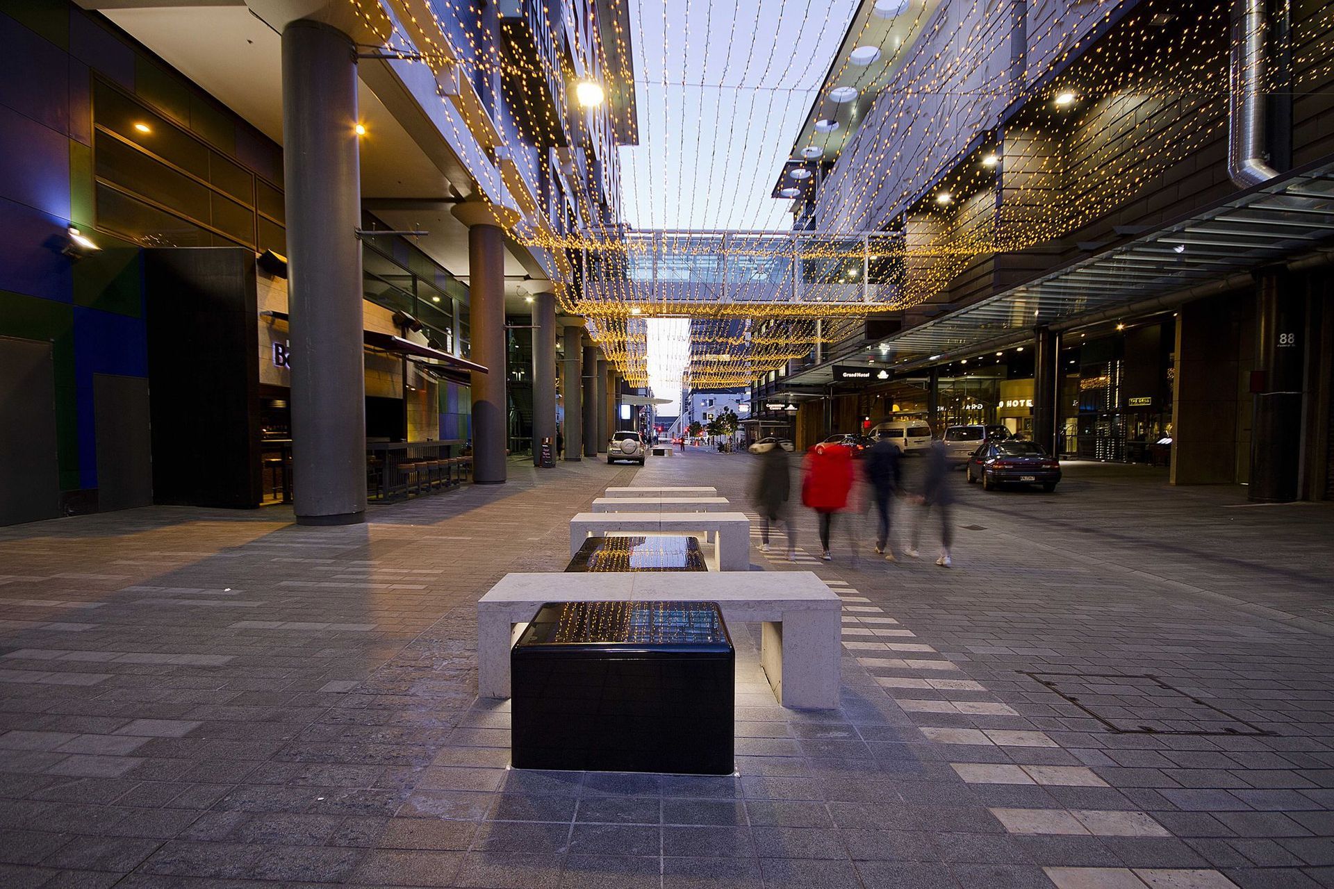 ArchiPro Project Summary - Redevelopment of Federal Street and Sky Tower Plaza enhancing visitor experience through pedestrian-focused design, featuring the Southern Hemisphere's first circular green wall and supporting Auckland's vision of becoming the world's most liveable city.