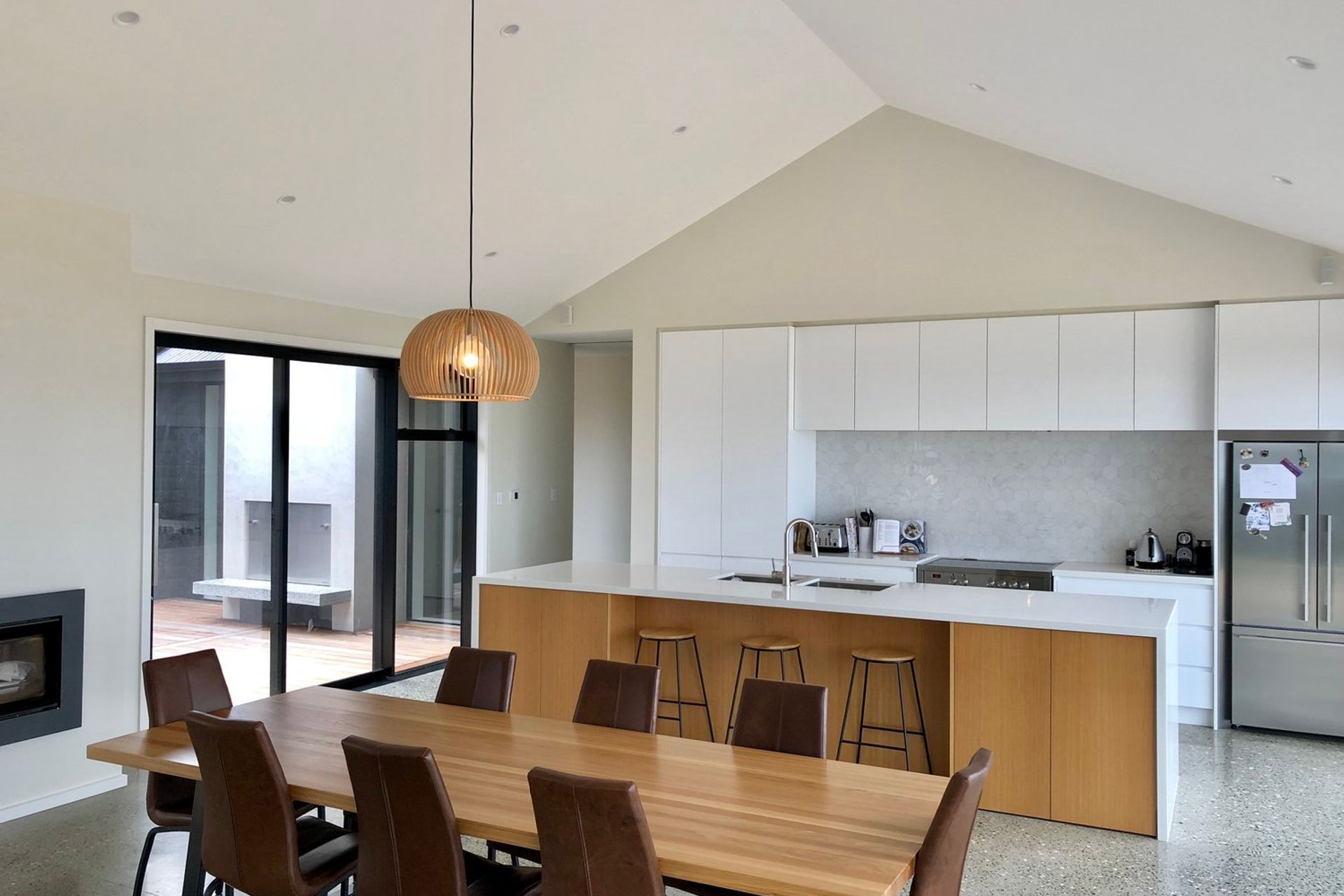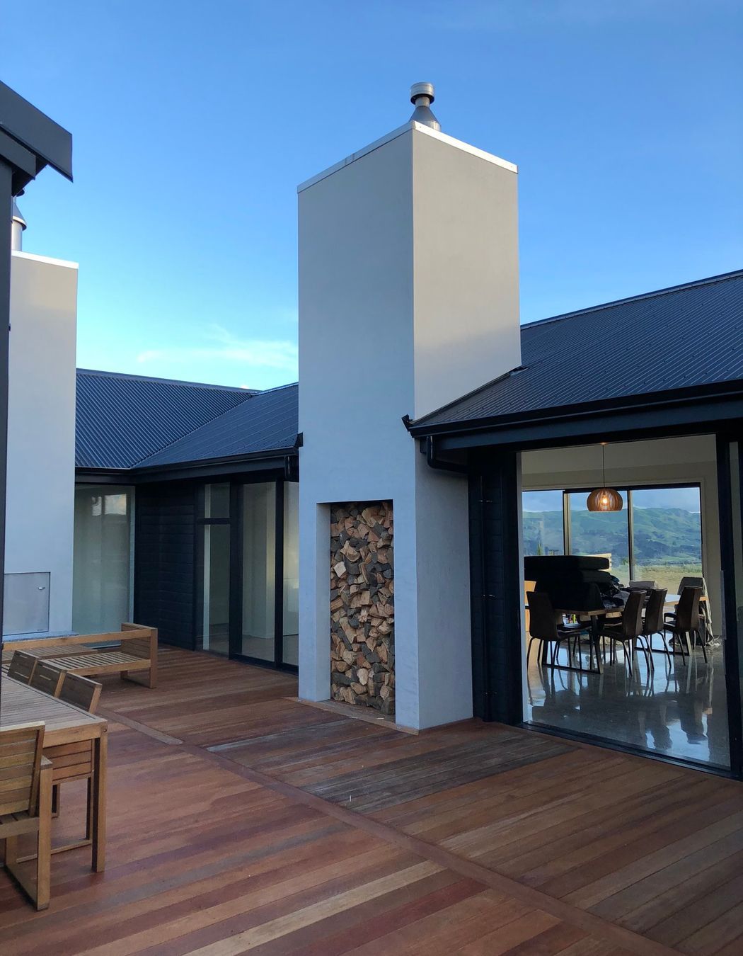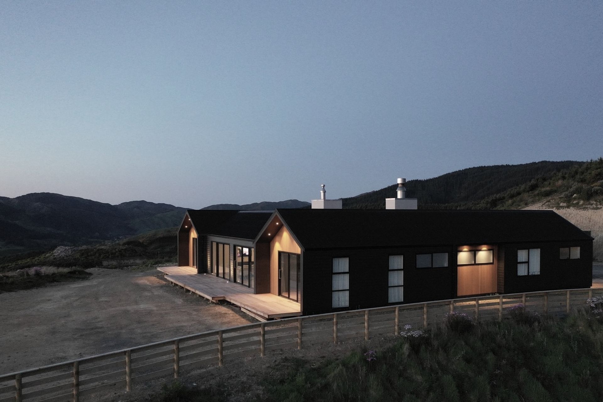 ArchiPro Project Summary - A stunning 320sqm hilltop home featuring 5-meter high ceilings, two striking 7-meter chimneys, polished concrete floors with underfloor heating, and elegant cedar gables, all set against a breathtaking backdrop of rolling hills and views of the South Island.