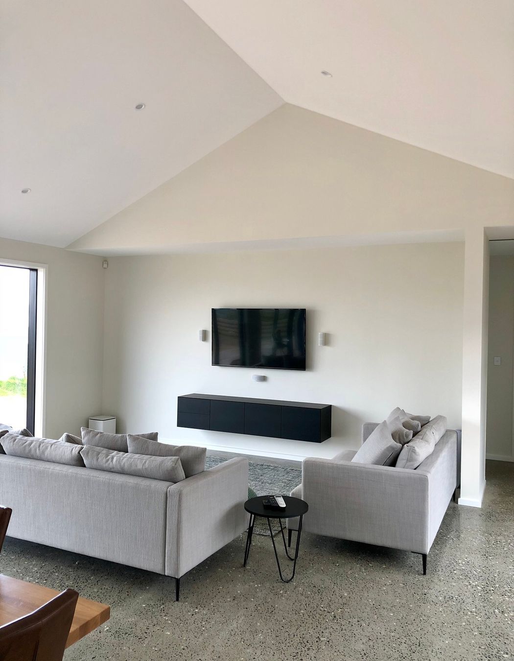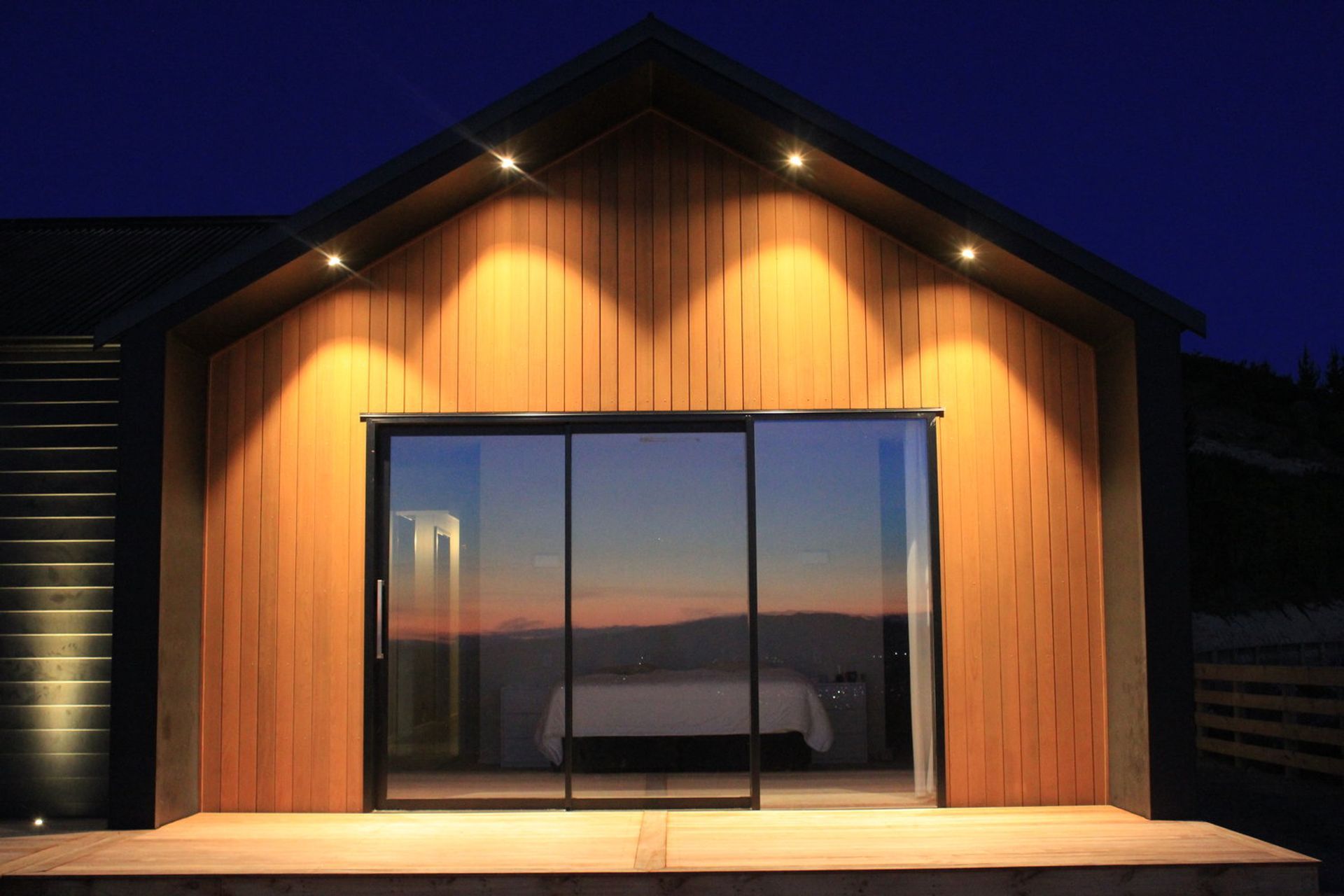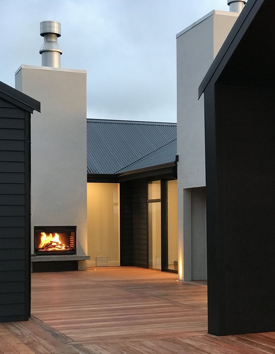 ArchiPro Project Summary - A stunning 320sqm hilltop home featuring 5-meter high ceilings, two striking 7-meter chimneys, polished concrete floors with underfloor heating, and elegant cedar gables, all set against a breathtaking backdrop of rolling hills and views of the South Island.