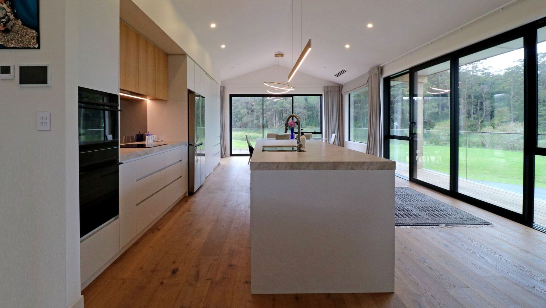 ArchiPro Project Summary - A modern kitchen by Maddren Homes featuring luxurious Florim Yamuna Silk Matte Porcelain benchtops and American Oak cabinetry, harmoniously blending nature and design with stunning views of Wieti Bay.