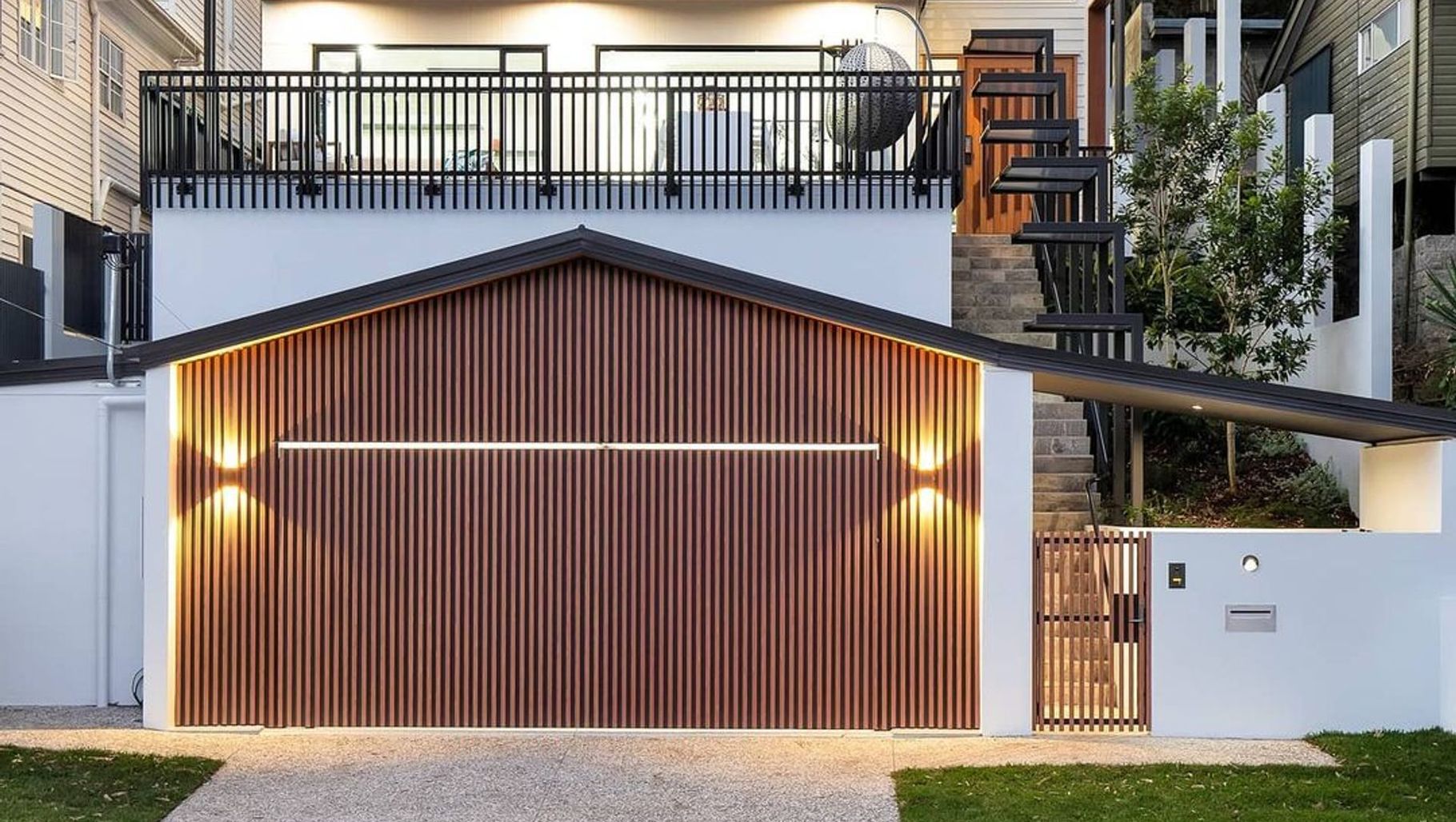 ArchiPro Project Summary - Stunning three-storey home in Bardon featuring a custom flush mount tilt door with a contemporary timber look, enhancing both security and aesthetic appeal.