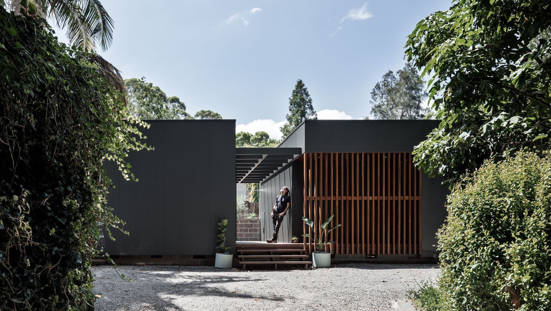 ArchiPro Project Summary - Contemporary granny flat and rumpus room designed to cantilever over a sloping site, featuring a striking black exterior and hardwood accents, completed in 2023.