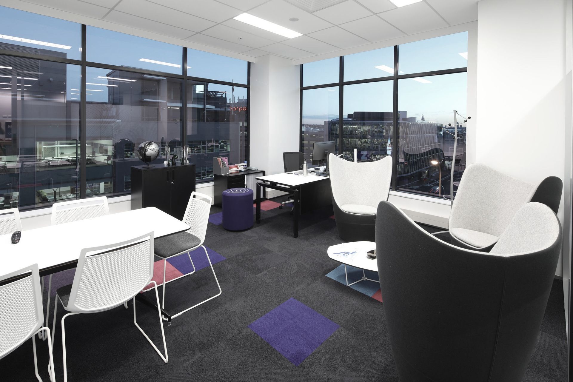 ArchiPro Project Summary - Comprehensive fit-out for Foster Moore featuring modern staff areas and kitchen, coordinated construction works including partitions, ceilings, and flooring, enhanced by vibrant carpets reflecting the Foster Moore branding.