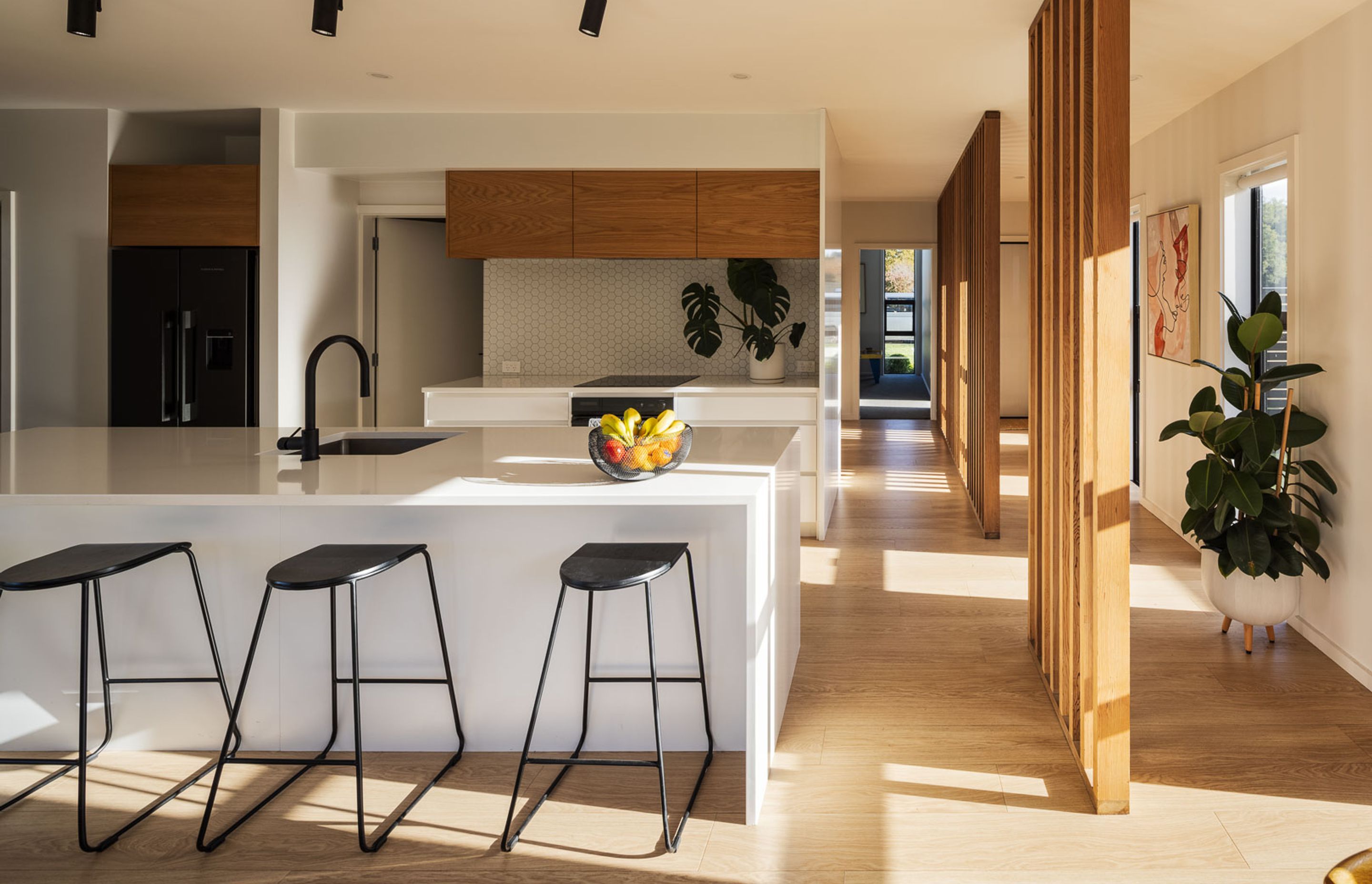 ArchiPro Project Summary - Four Gables House: A thoughtfully designed four-bedroom family home featuring open-plan living, seamless indoor-outdoor connections, and a striking white exterior, set within a new residential development in Greytown.