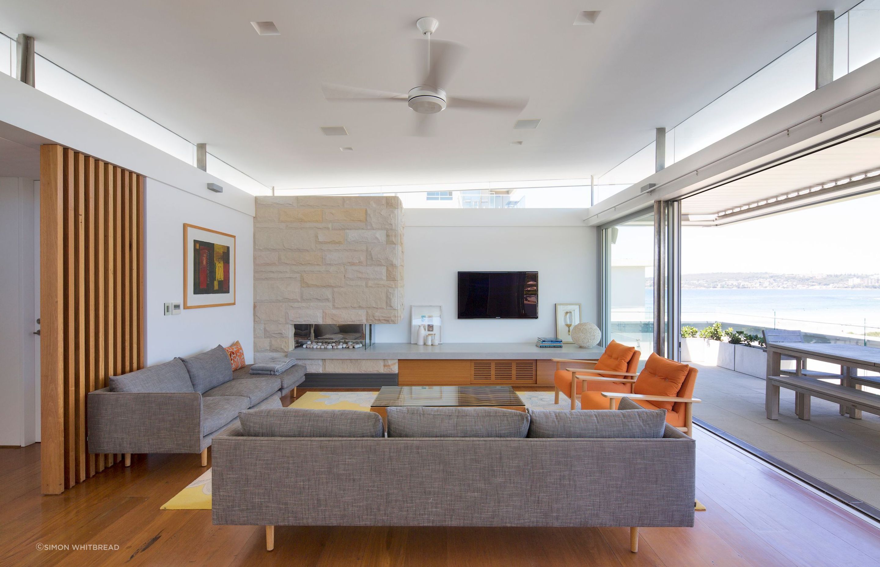 ArchiPro Project Summary - A luxury residence designed to withstand harsh southerly winds, featuring stunning views of Freshwater Beach and a harmonious blend of contrasting materials for year-round enjoyment.