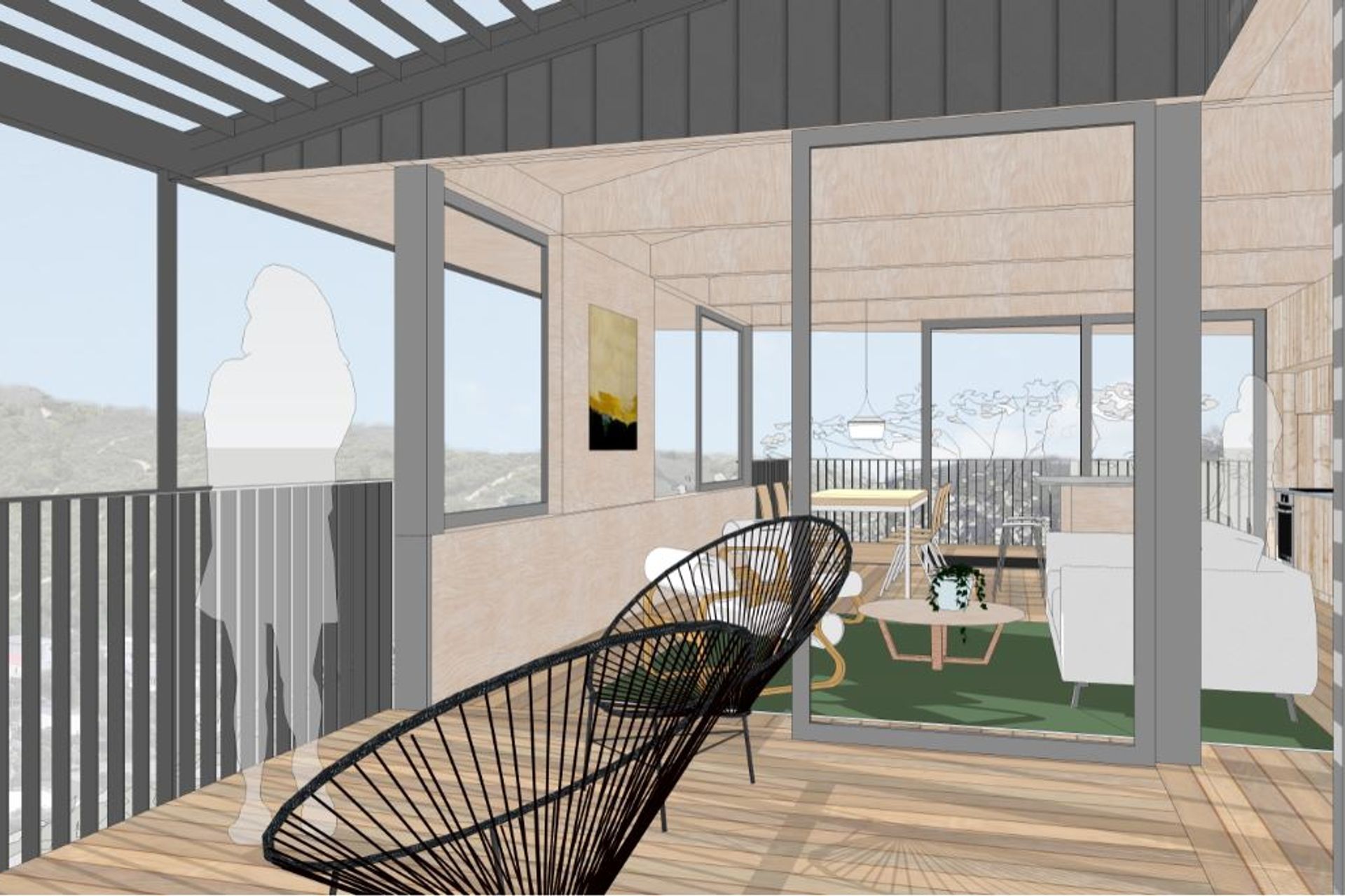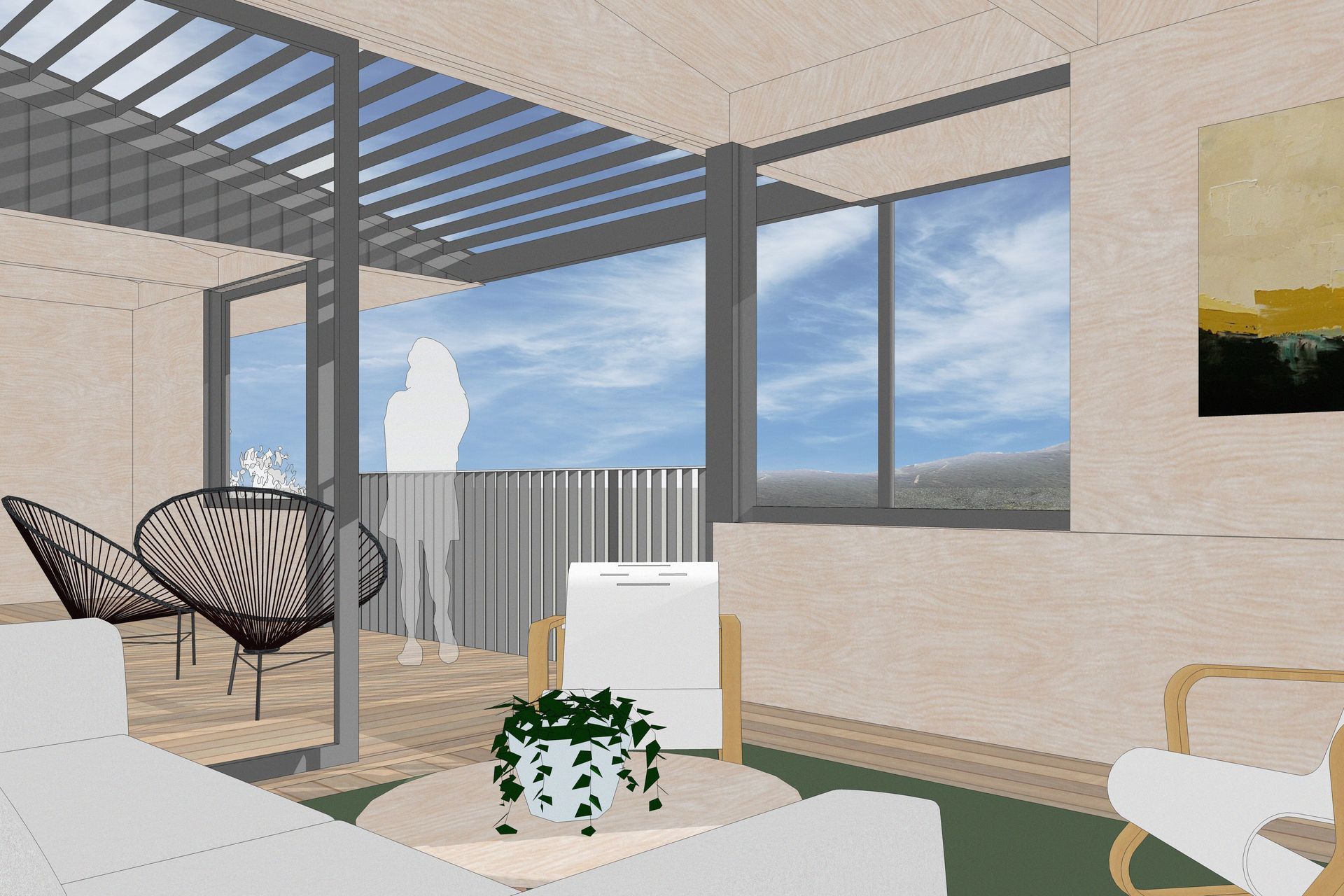 ArchiPro Project Summary - A compact, timber-structured home designed for a couple and their dogs, skillfully positioned on a steep slope to ensure stability, privacy, and stunning northern valley views, featuring a central sheltered deck for outdoor living.