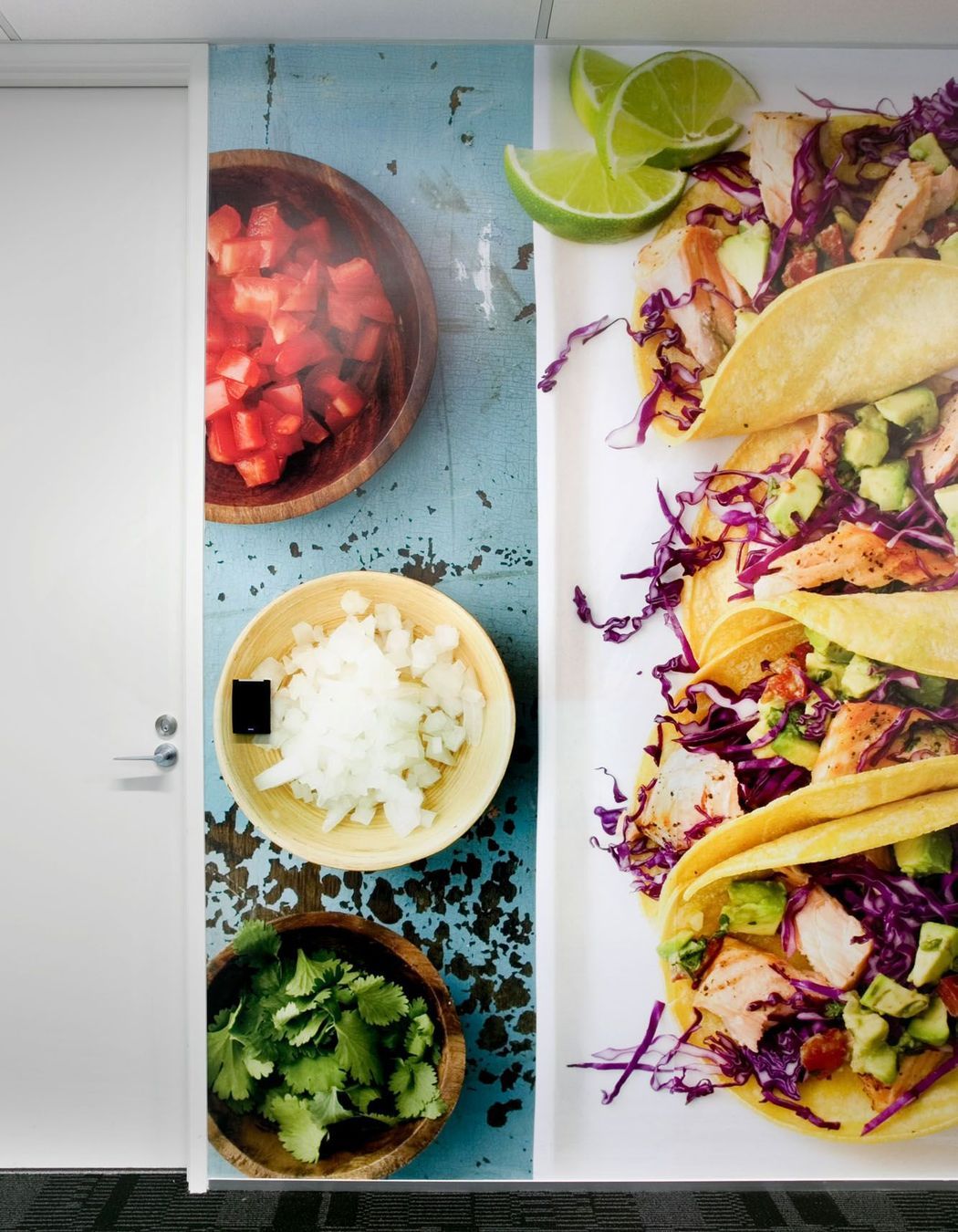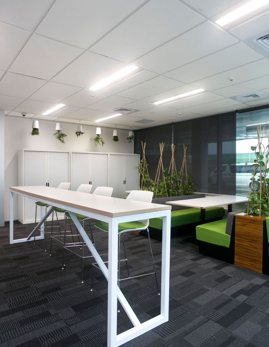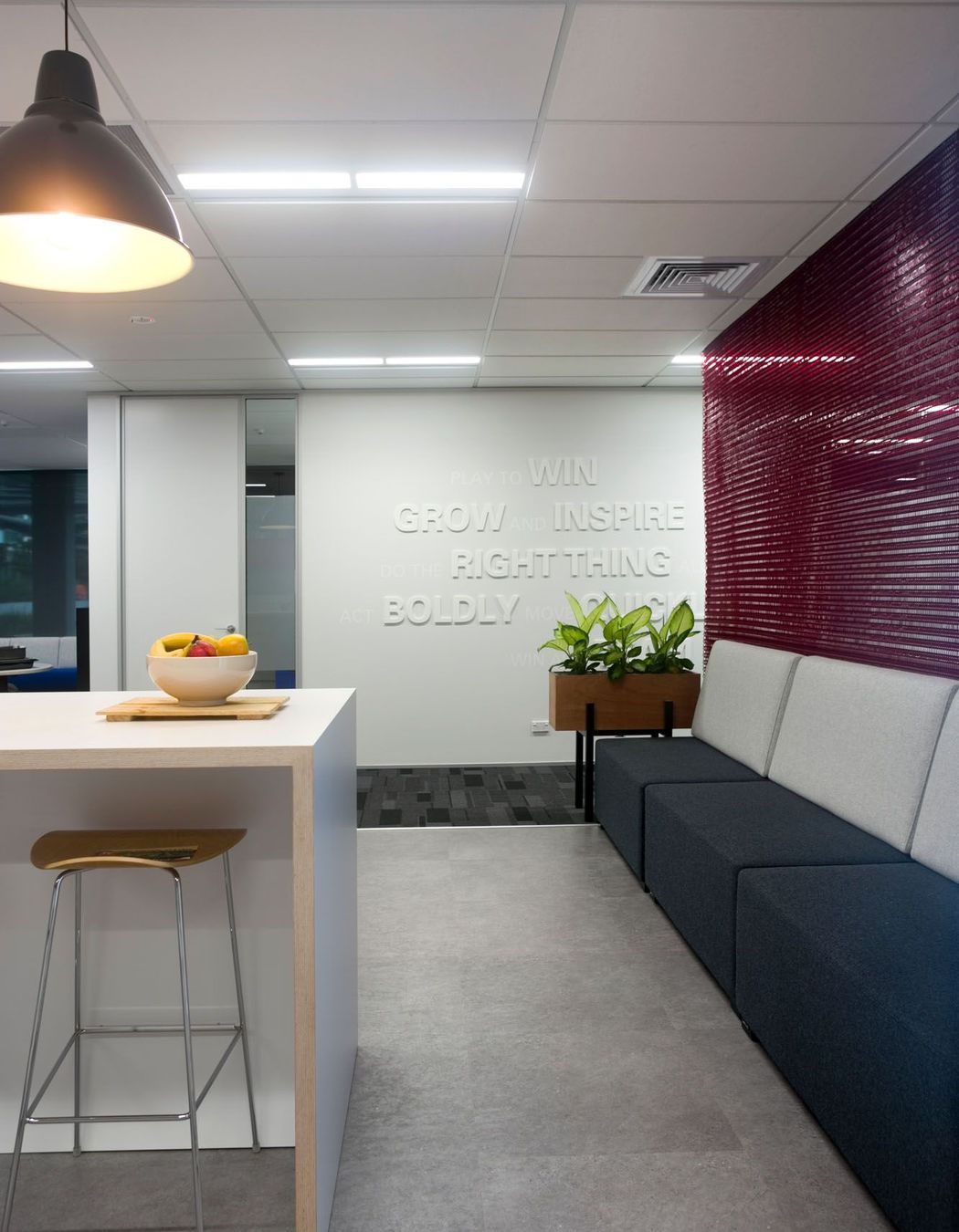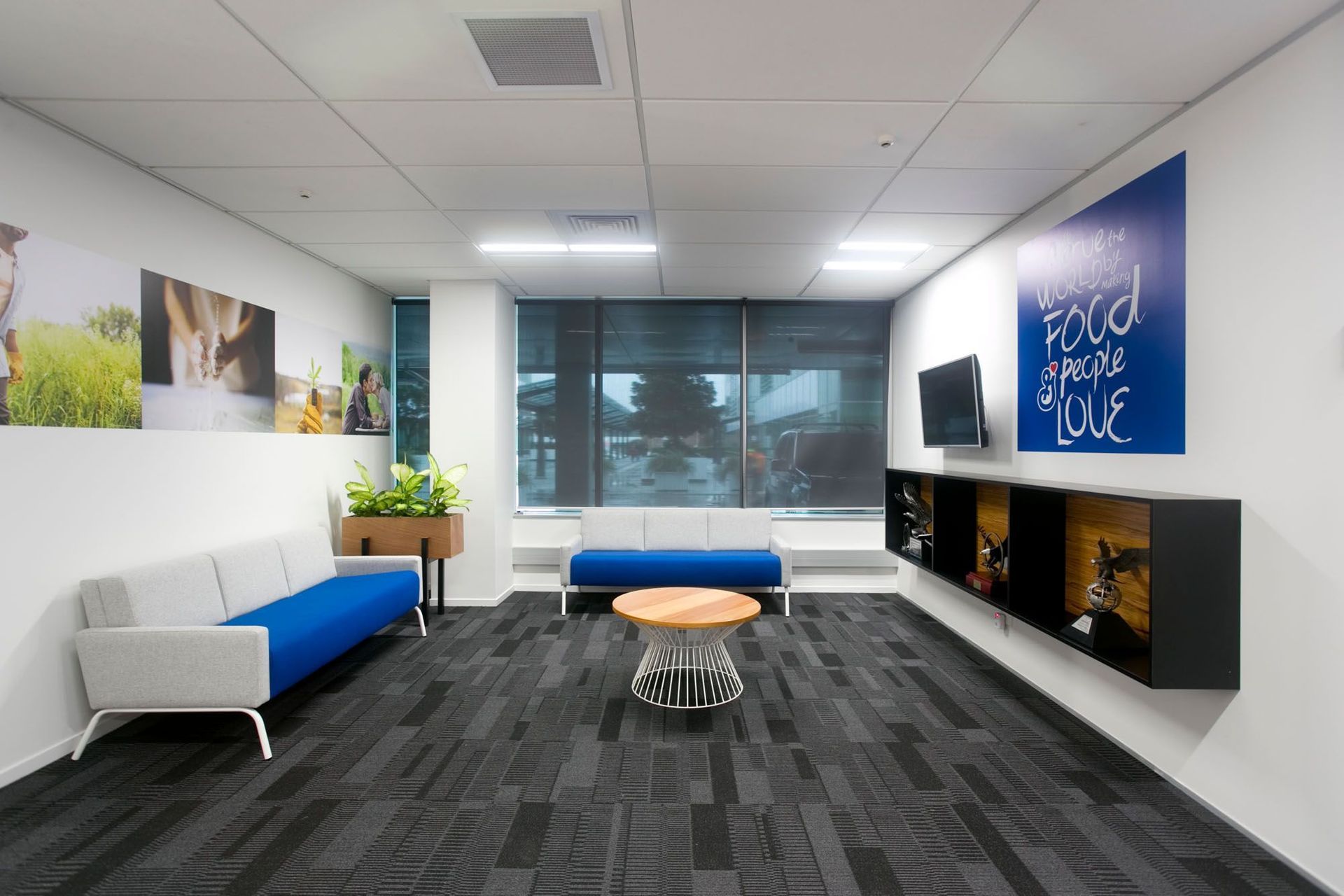 ArchiPro Project Summary - Office fitout for General Mills featuring collaborative spaces, meeting rooms, and a vibrant open kitchen, completed in 2016 with extensive coordination across international teams to meet specific IT and design requirements.