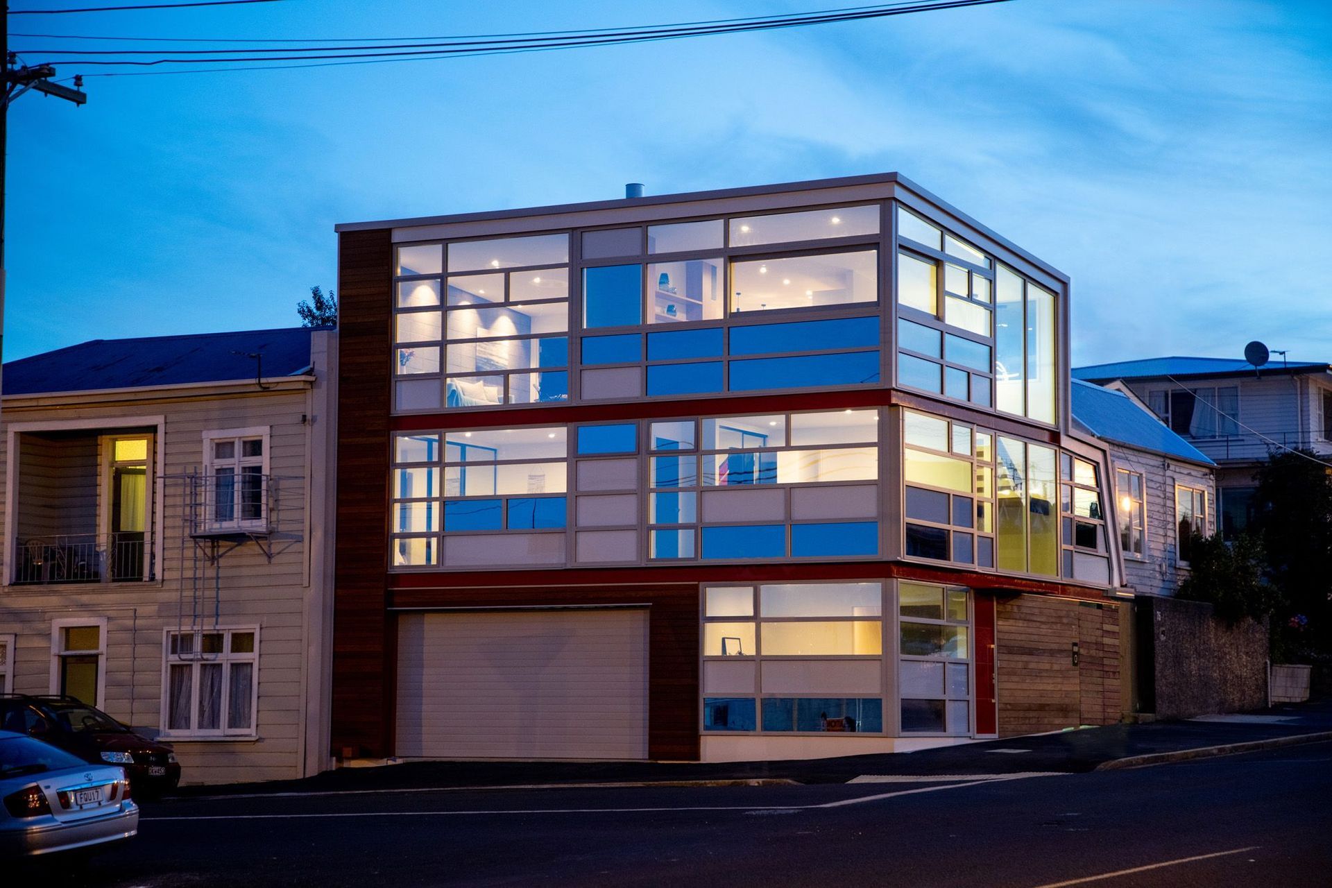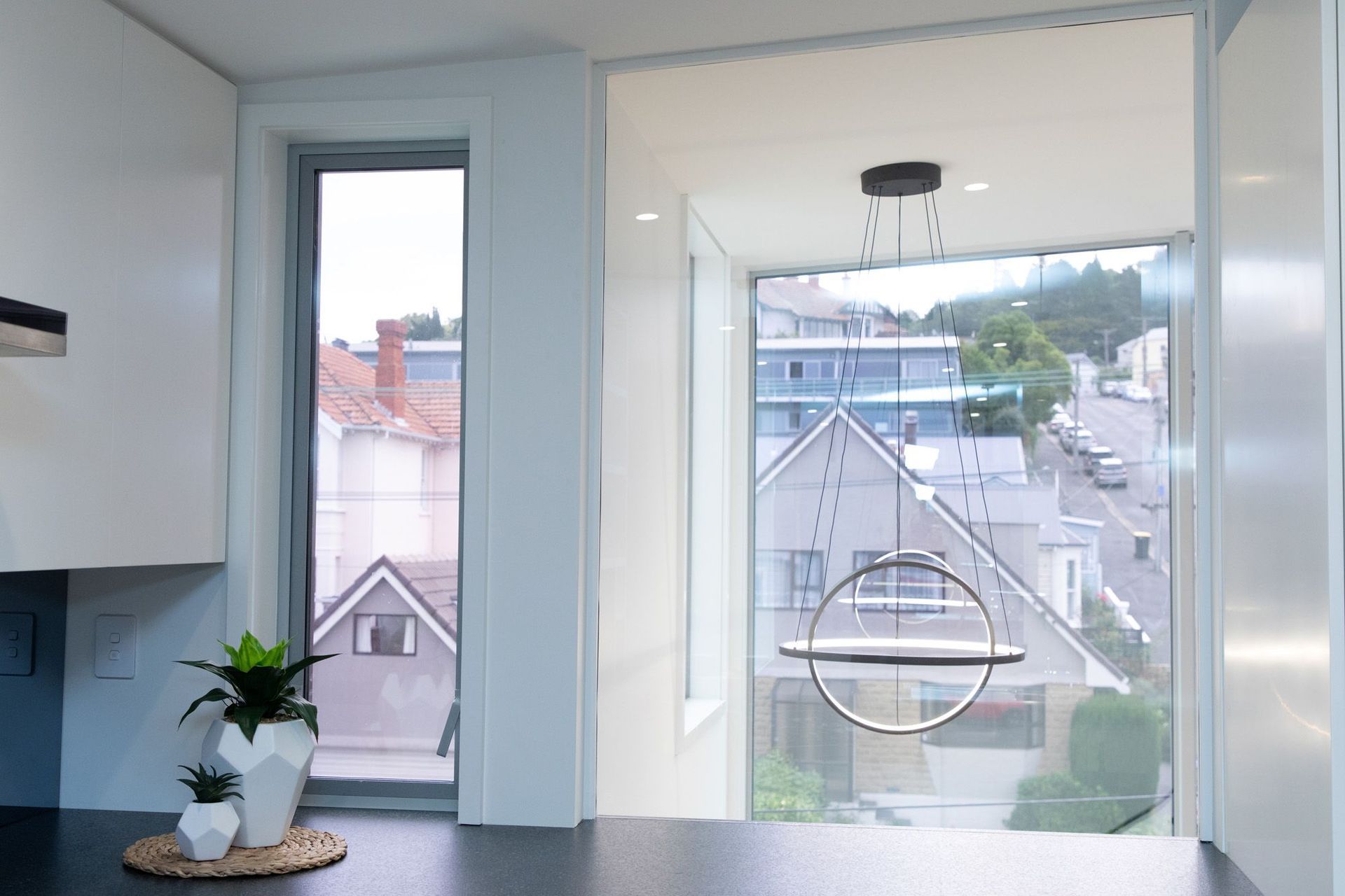 ArchiPro Project Summary - Three-storey townhouse in Dunedin featuring a striking combination of concrete, steel, and mirrored glass, designed to enhance spatial perception and adapt to its surroundings, with stunning views of the city and Otago Harbour.
