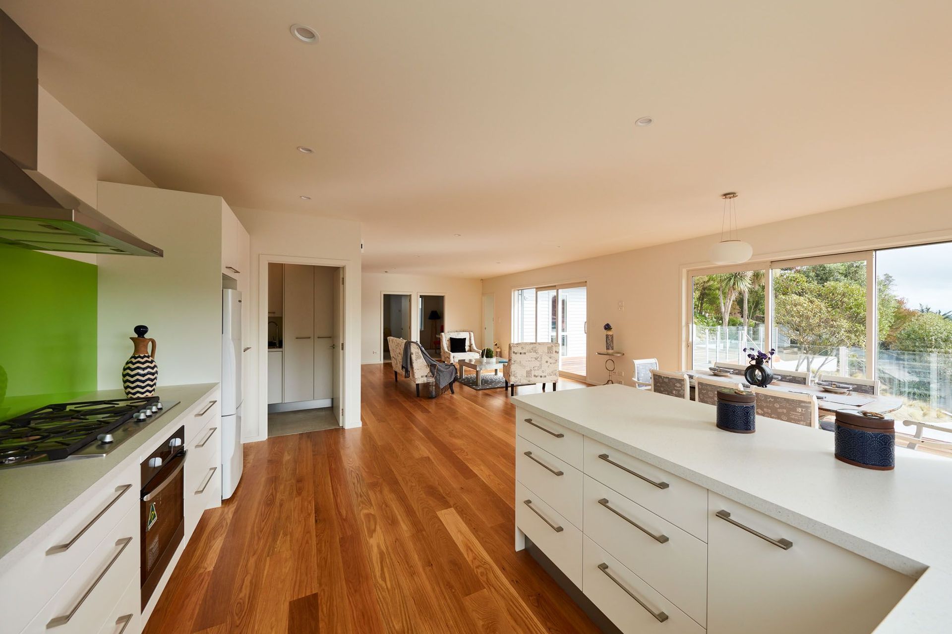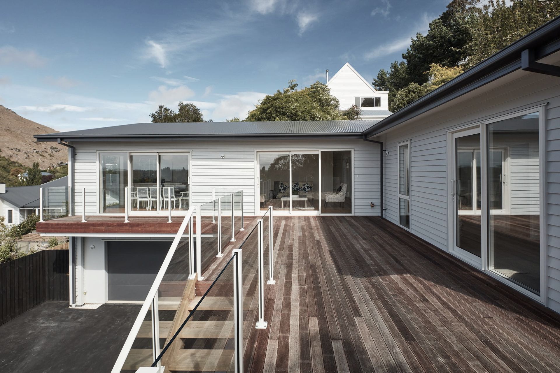 ArchiPro Project Summary - Glenview House: A modest yet functional hillside home designed to maximize stunning views on a challenging site, featuring timber weatherboard cladding and expansive American Oak flooring throughout the living area.