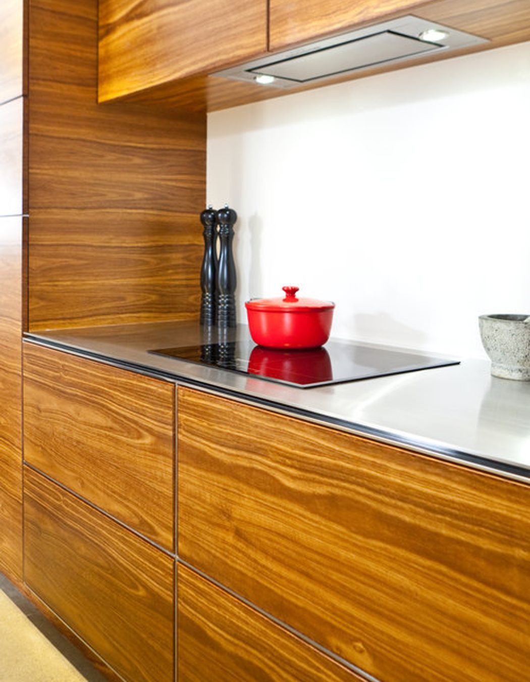 ArchiPro Project Summary - Innovative showroom kitchen showcasing experimental materials and design details, featuring advanced Blum hardware, electronic opening cupboards, and a striking combination of hand-stitched veneer and solid timber elements.