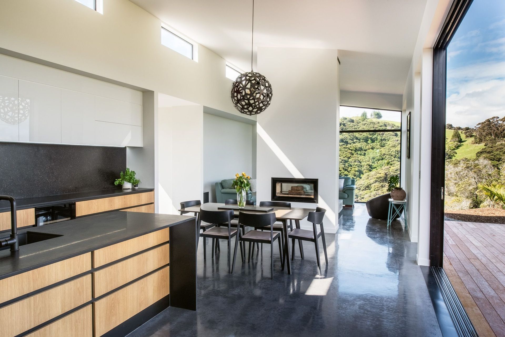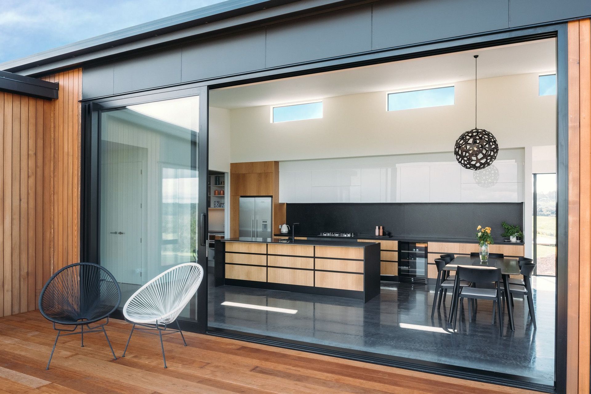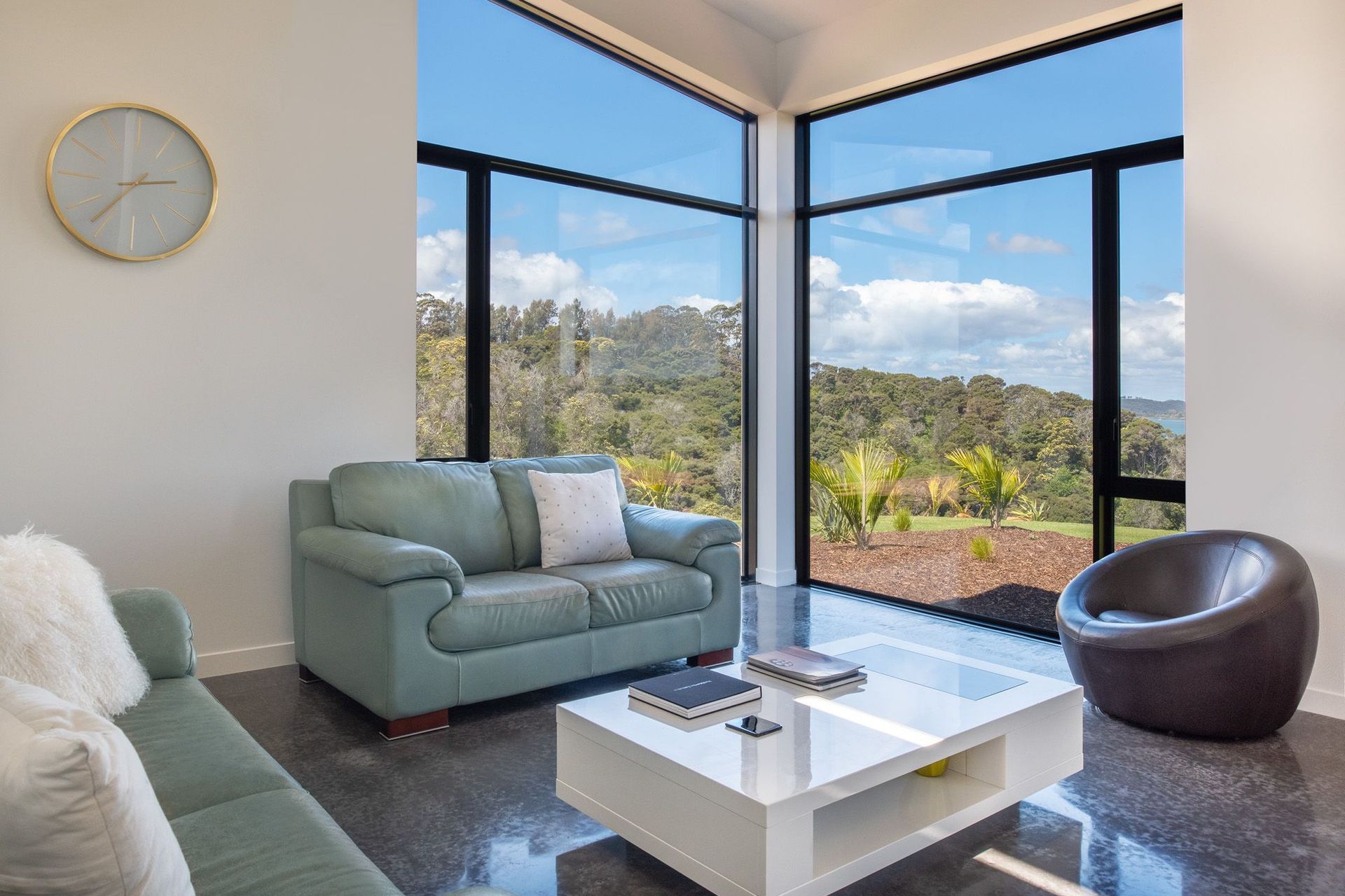 ArchiPro Project Summary - Goldie House: A modern residence by JK BUILDS LTD, featuring stained cedar and black Titan Panel for a striking façade, expansive glazing, and polished concrete floors, all designed to maximize stunning views over the Kerikeri inlet.